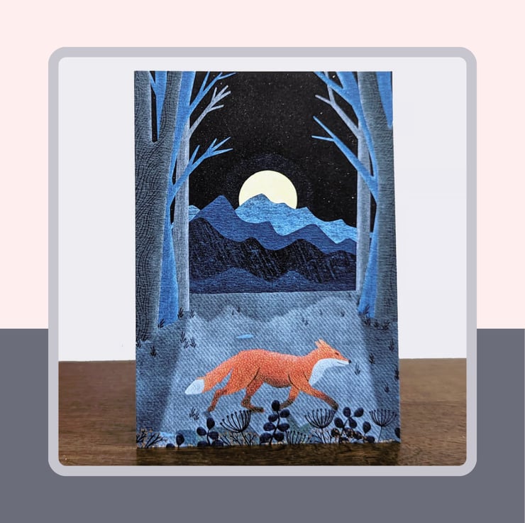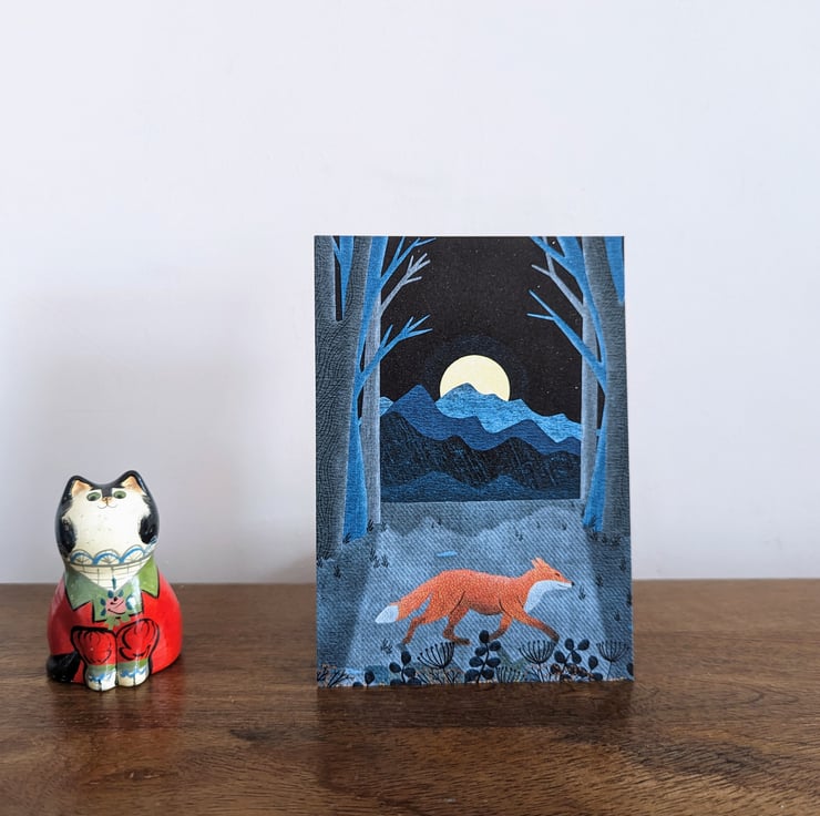 My digital painting of a fox running through the moonlit woods has been professionally printed onto A6-size 350GSM recycled card.