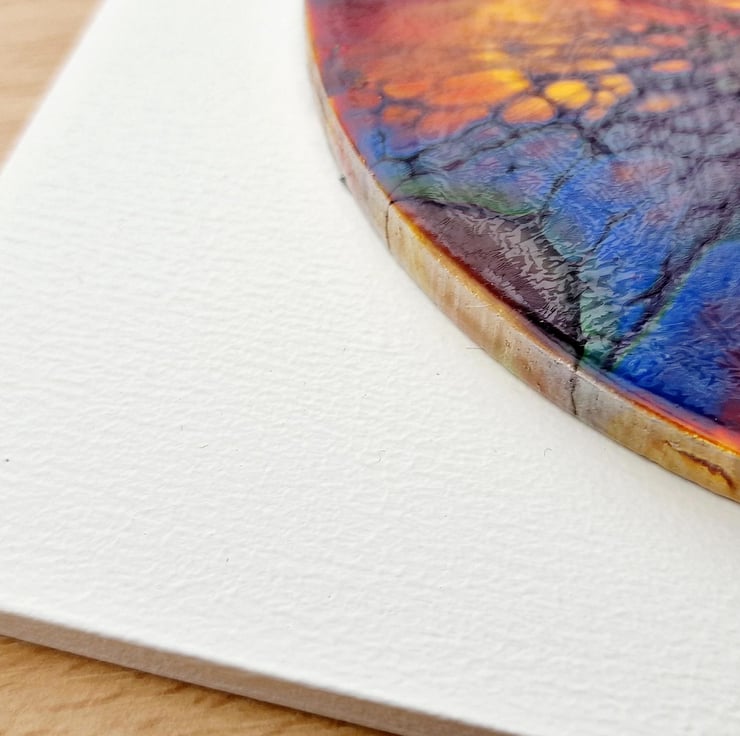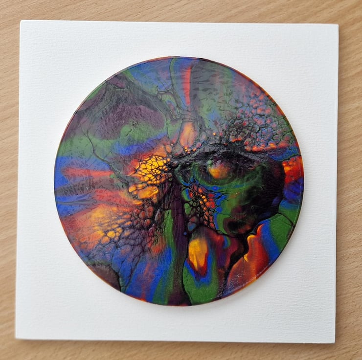 The diameter of the circular painting is 14.3cm, mounted on a 18.8cm x 18.8cm backboard.