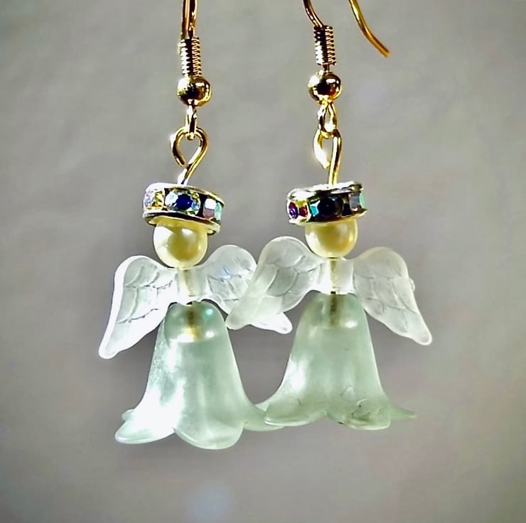 Pretty little angels with a translucent pale blue-green lucite flower for a skirt, a glass pearl head, translucent white acrylic wings and a sparkly, silver-coloured rhinestone halo.
