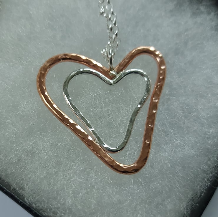 A perfect romantic gift, this lovely mixed metal pendant features two hearts nestled one within the other. The outer heart is made of 2mm copper wire and the inner one is 1.5mm sterling silver. The two hearts are soldered together and have been hammered to create a textured surface. A large jump ring has been added at the top to act as a bail for attachment to the 18 inch/45cm sterling silver trace chain. The size of the pendant is about 3x3.5cm.