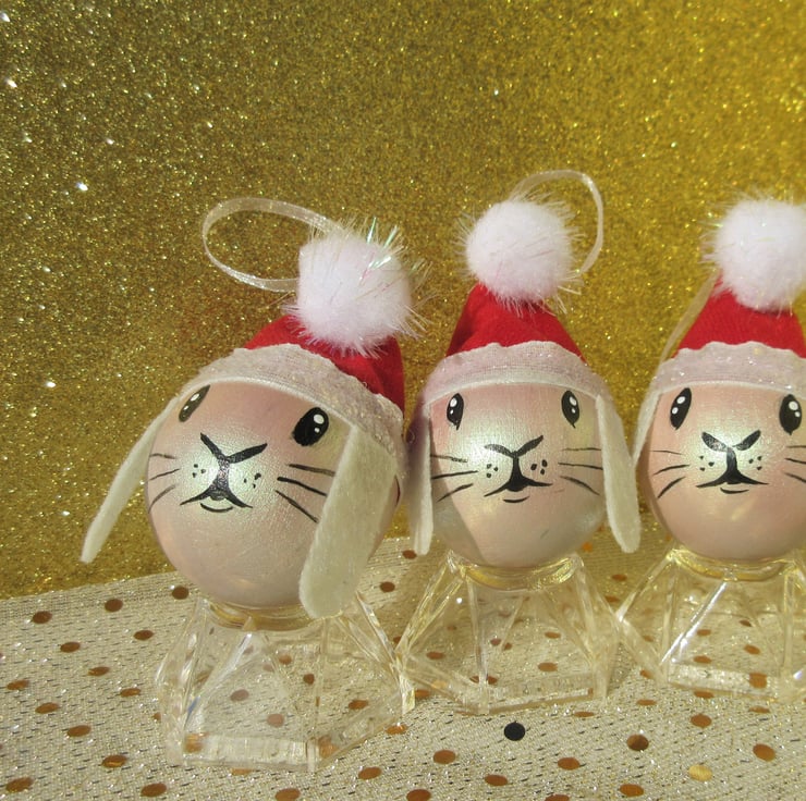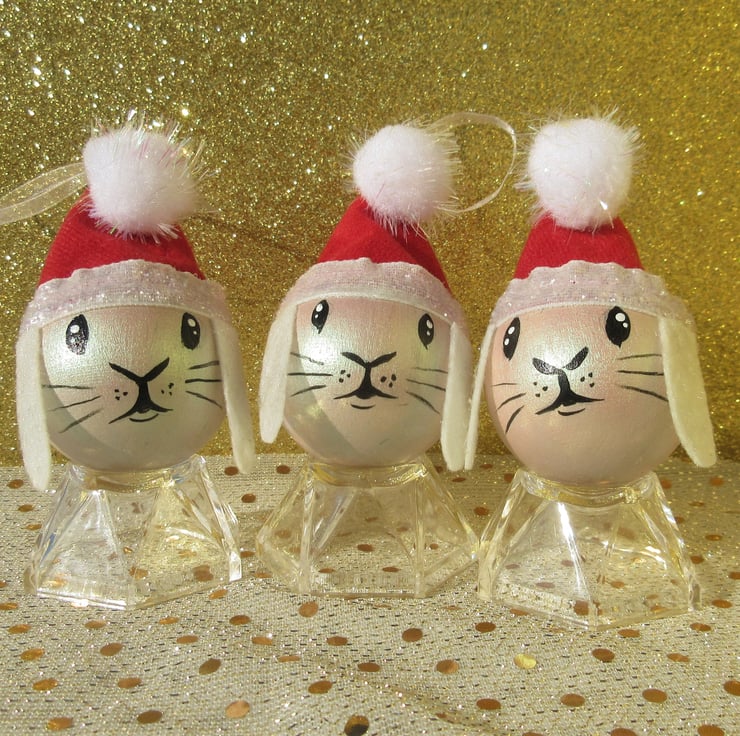 A set of three hand painted wooden baubles, painted to look like rabbits.