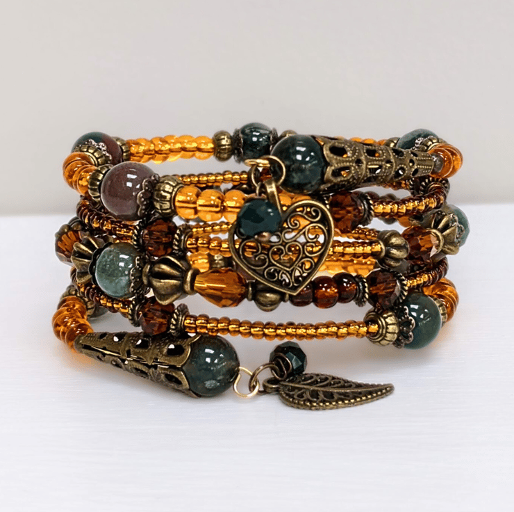 Featuring beautiful orange and brown hues, this bracelet is sure to capture the essence of the season. It's decorated with green Indian agate beads and complemented by bronze spacer beads and charms, creating a truly unique accessory. This seed bead memory wire bracelet gives the appearance of individual bangles but with the convenience of being all one piece which simply wraps around your wrist forming a stacked cuff. No fussy catches to cope with. There is no fear of it dropping off your wrist either!