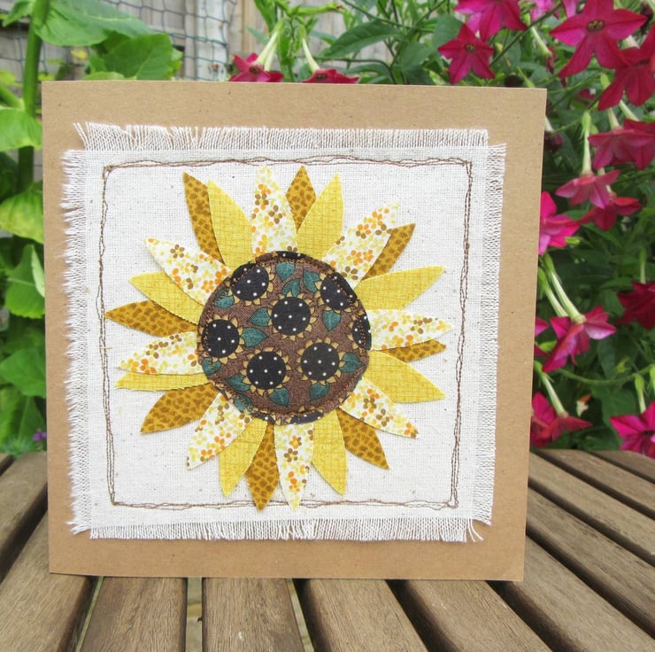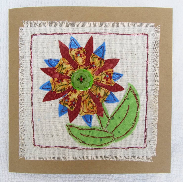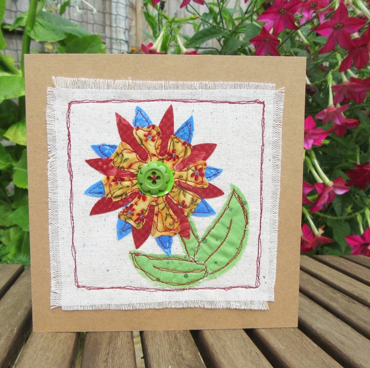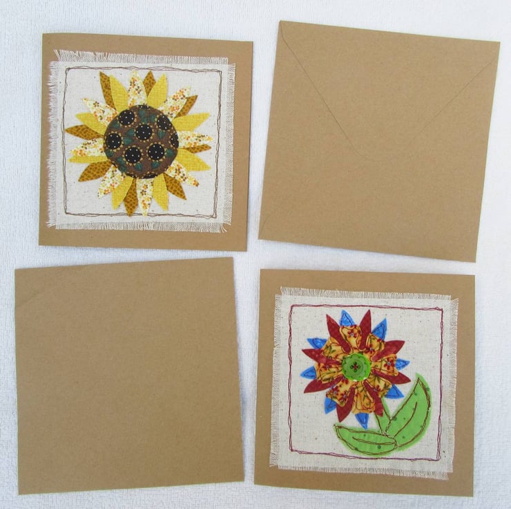 Two square cards, 6 x 6 (15cm x 15cm) featuring fabric flowers with free motion stitching detail. Free UK post and packing.
