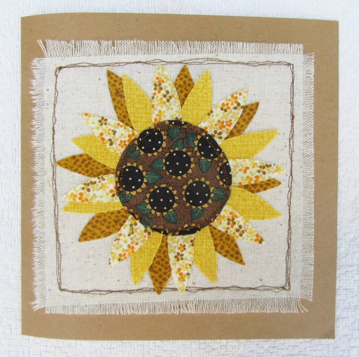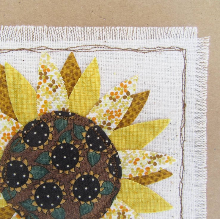 I’ve used layers of hand cut fabric shapes to create a flower on each of these cards. One in the style of a sunflower, the other a bright fantasy style flower. The fabric flowers are stitched to unbleached linen which in turn is stitched onto the natural colour card.
