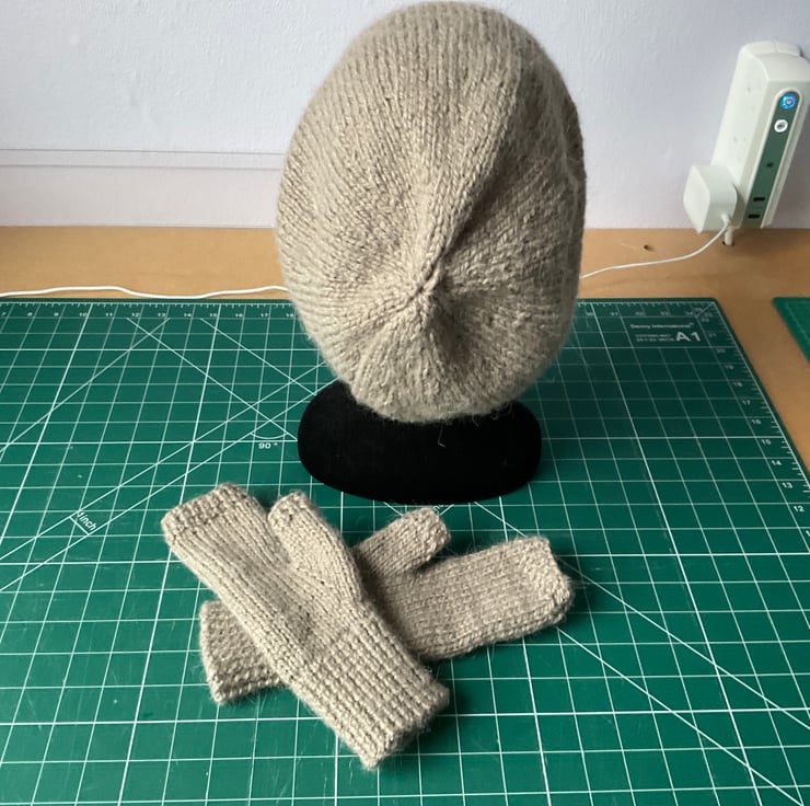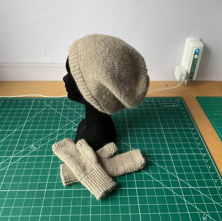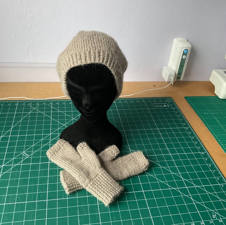 Beautiful hand knitted slouchy style hat with matching fingerless mitts.