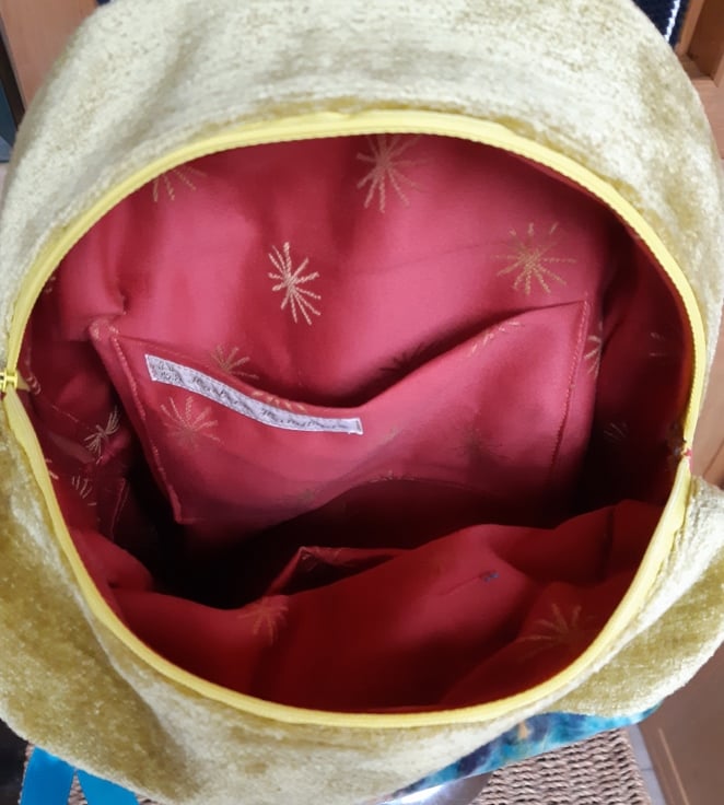 Practical backpack in gold velvet, with abstract printed velvet panel. Zipped front pocket, zipped main compartment, lined in terracotta brocade with inside pockets. Adjustable cotton webbing straps.