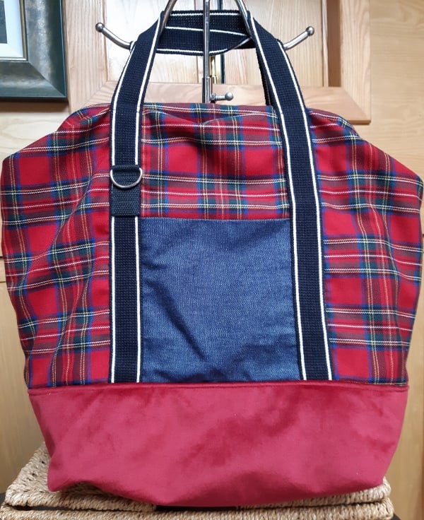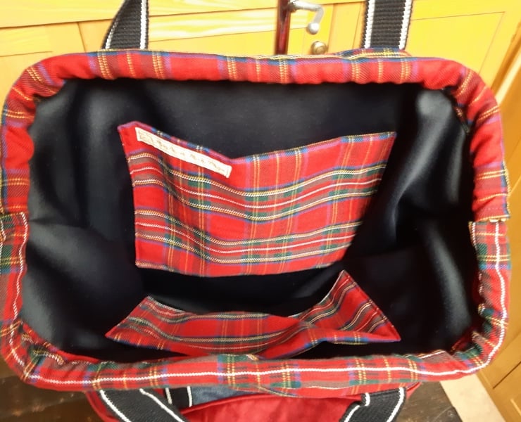 Beautiful tartan bag on a 45cm sprung metal frame, with matching velvet base and denim outer pockets. Lined in black satin, with tartan inside pockets. Black cotton webbing straps, with integral metal rings and an extra detachable strap for wearing on the shoulder or crossbody as required.