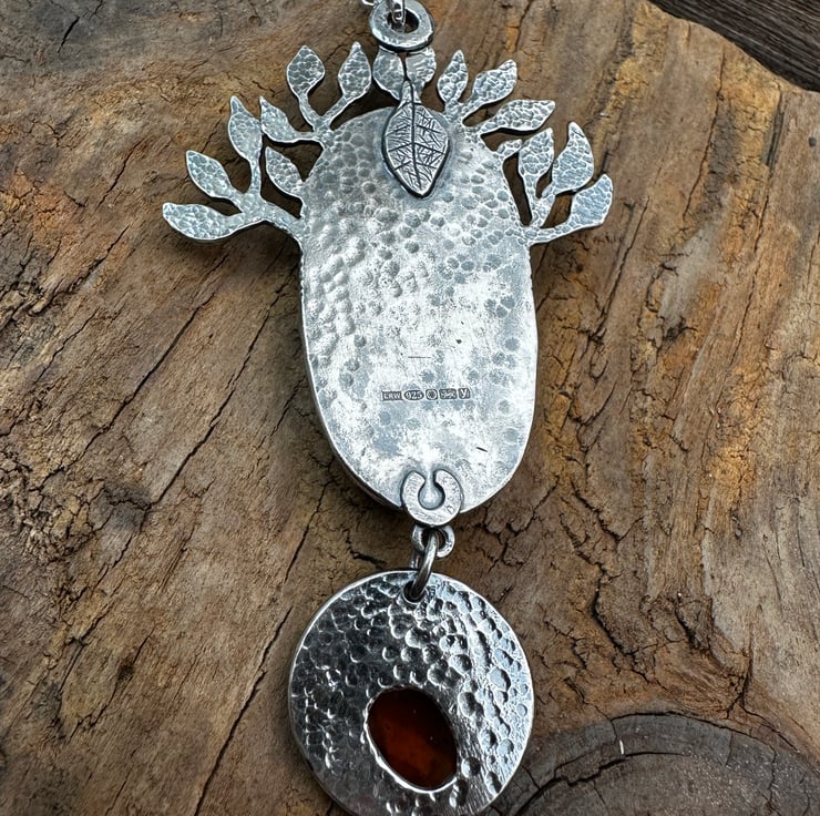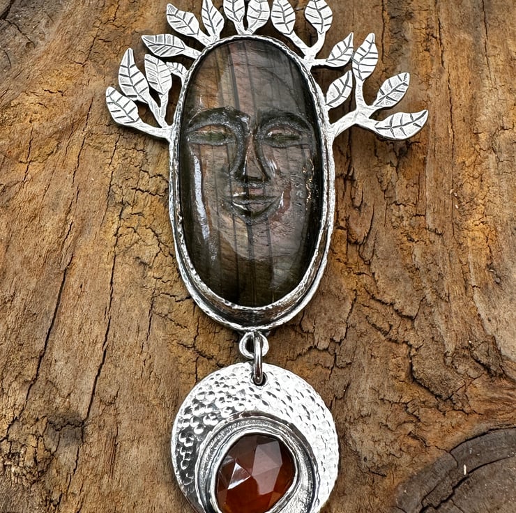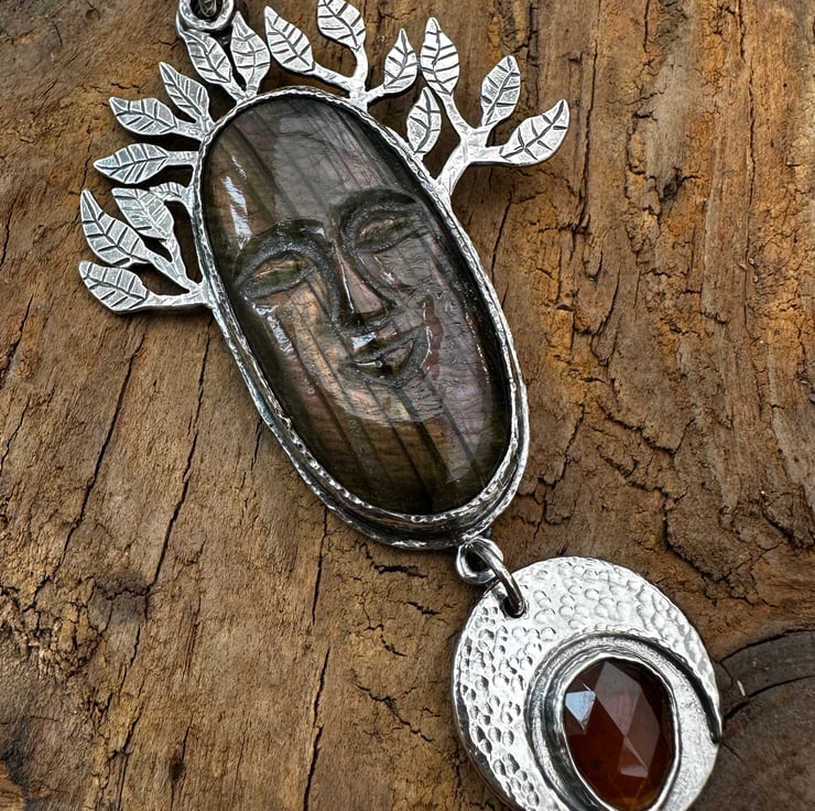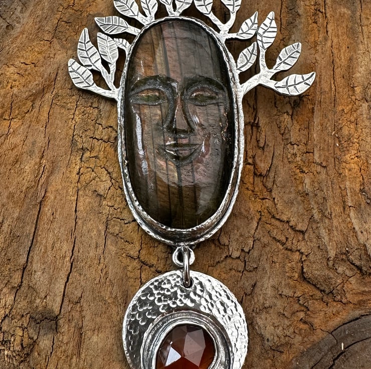 This pendant is inspired by the carved labradorite face I purchased which I thought would make a beautiful tree spirit. I have also set a rose cut 'tango' garnet cabochon which is more orange in colour than the usual garnet red - it may appear more red in the photos.