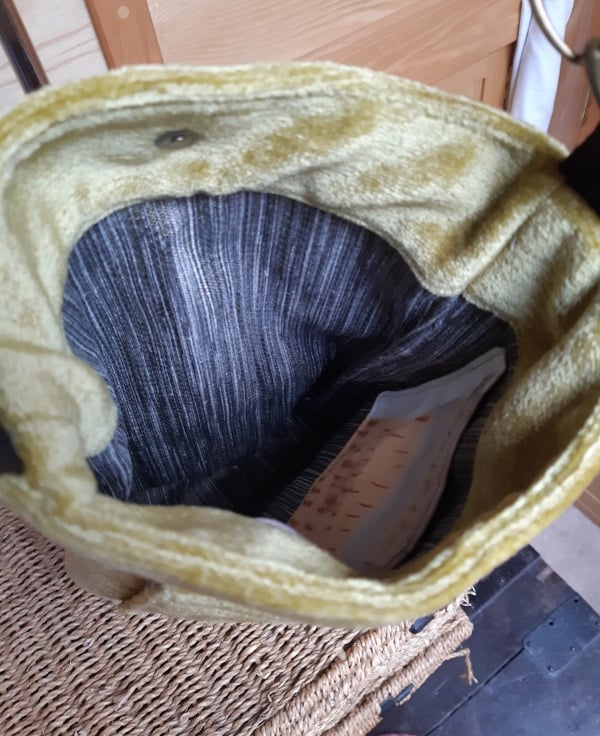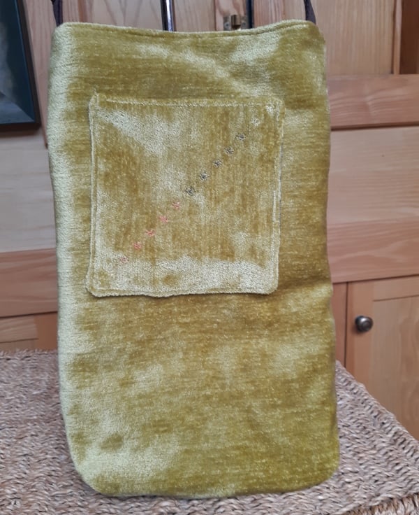 Another deep and slim crossbody bag in gold velvet and tartan, with zipped outer pocket, patch pocket on the back, and machine embroidery details. Lined in striped fabric, with inner pocket, magnetic fastener and adjustable cotton webbing strap.