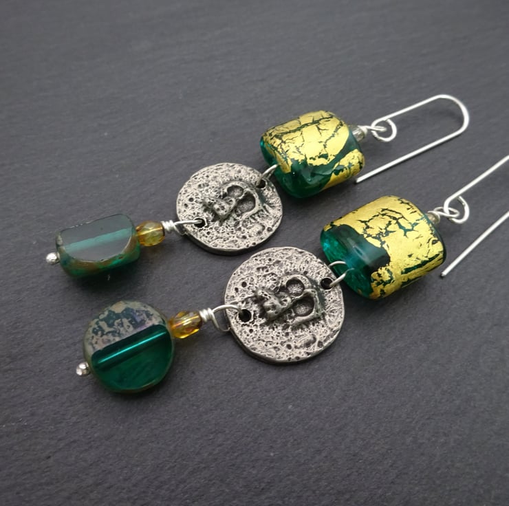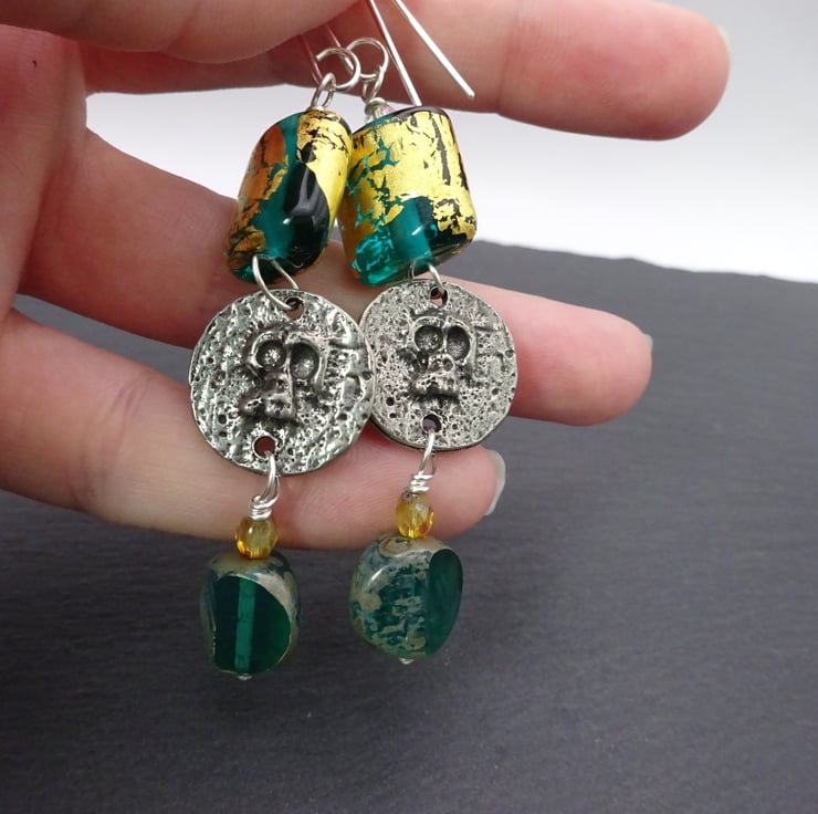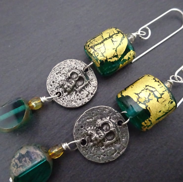 A pair of earrings made with handmade sterling silver ear wires, handmade lampwork glass beads, handmade pewter skull connectors and green Czech glass beads.