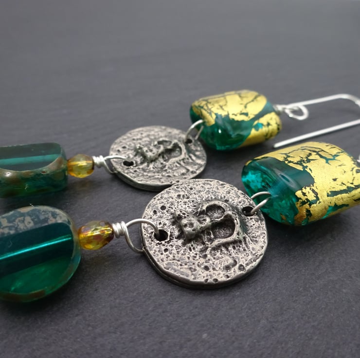 The lampwork beads have been handmade by me using teal green glass and gold leaf.