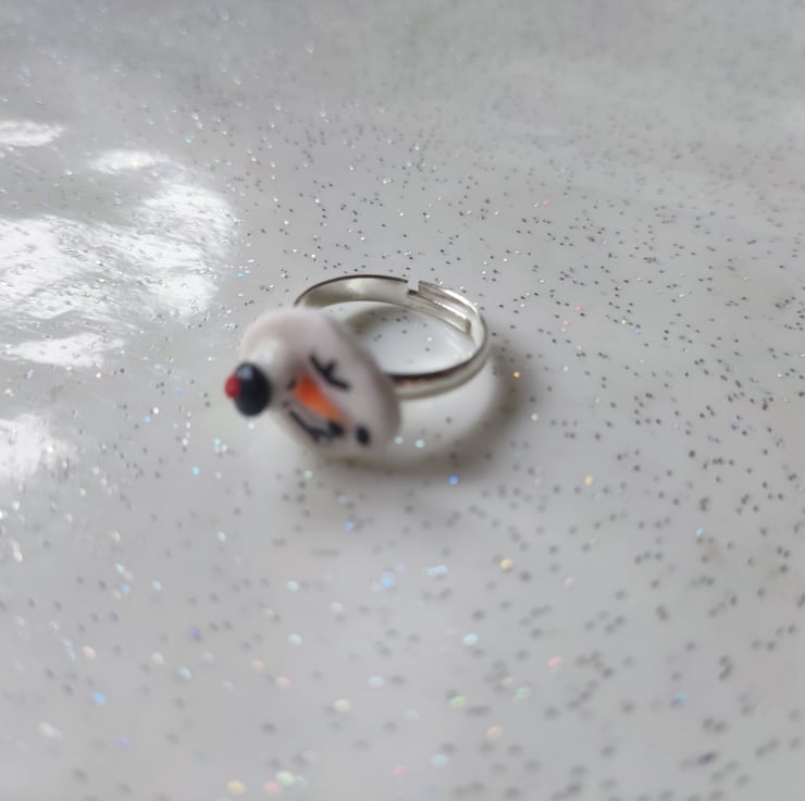 Love this melted snowman, and it will fit anyone as it is attached to an expandable silver coloured ring base x