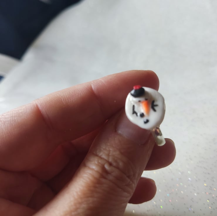 The snowman is sealed with resin and glued to a silver coloured expandable ring base