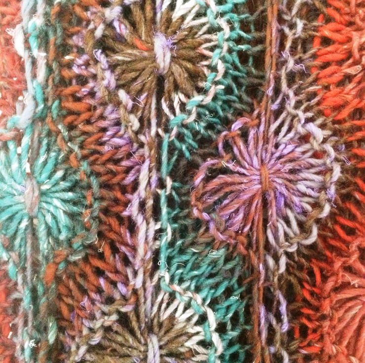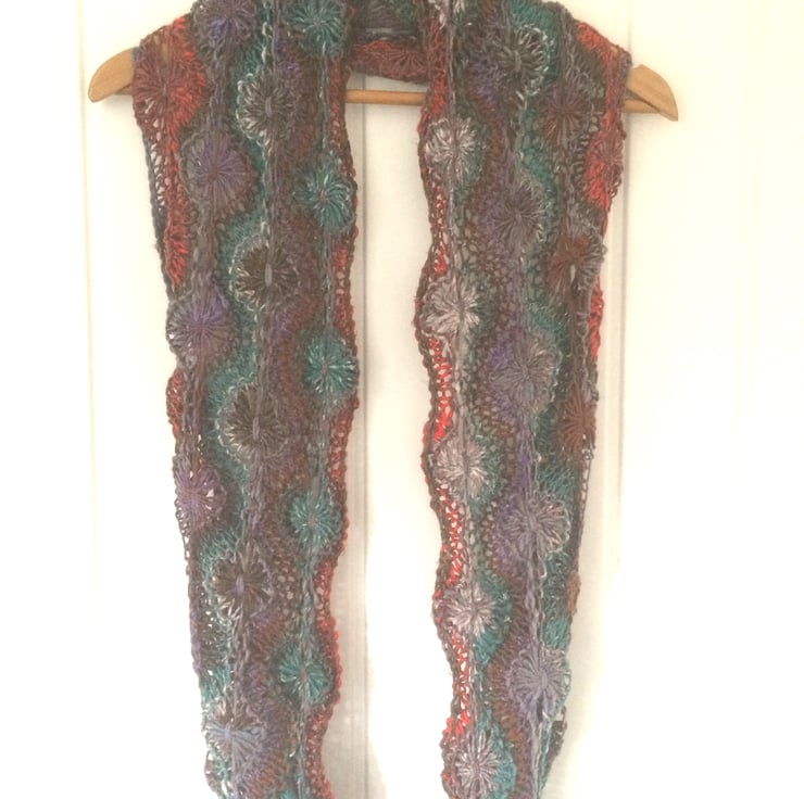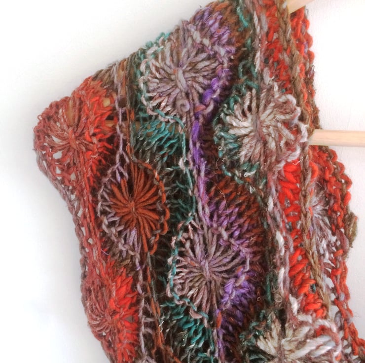 Wonderful rings of flowers in a stunning array of autumn jewel colours adorn this lace cowl. Its a massive 6' long so can be wrapped round not just twice but 3 times if needed. 8" wide with a lovely sculptured wavy edging. Its near enough reversible too. On the underside there is a slight difference in the flower detail which isn't obvious when worn.