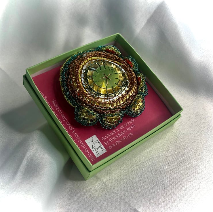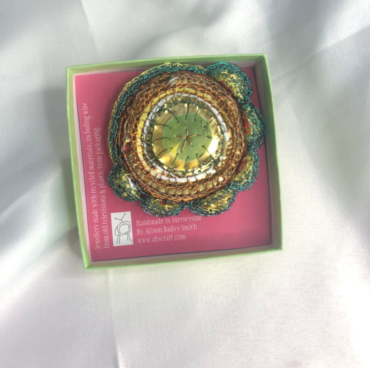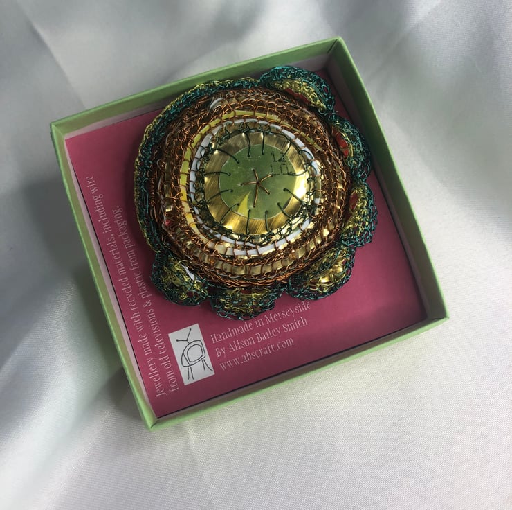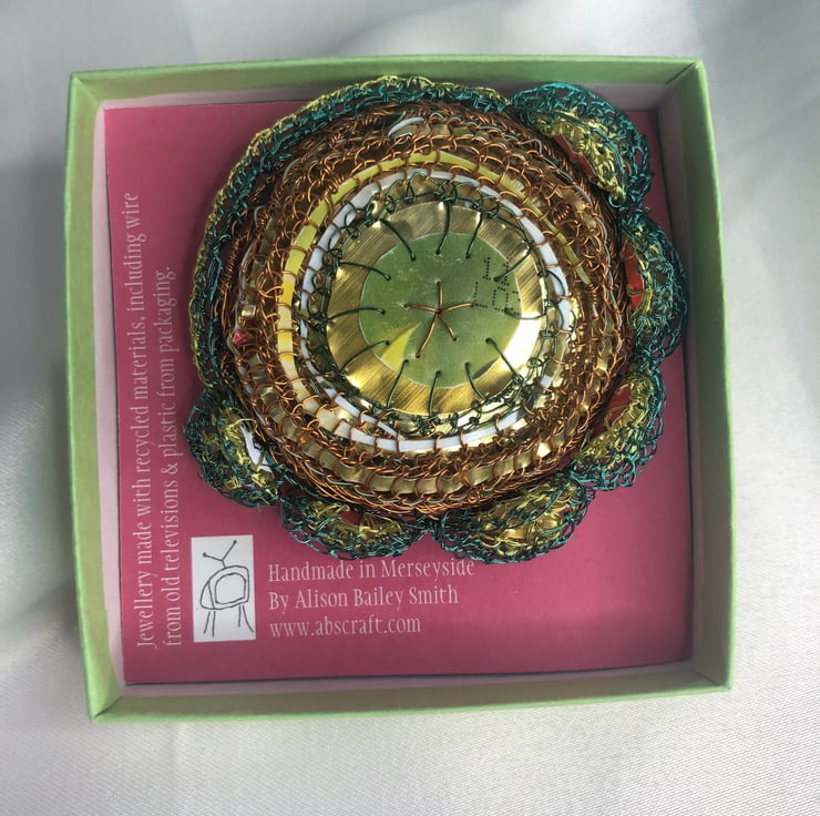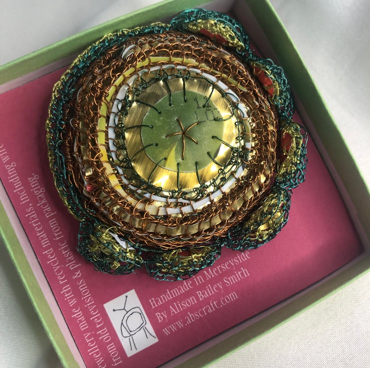 Made in Wirral by me, Alison Bailey Smith. I trained as a jeweller in Edinburgh in the 80s and 90s and have been recycling since then, in different places all round the world. I am now back in the UK and recently acquired wires from lots of old televisions so am having great fun with new colours. My work is definitely a by-product of the 21st century & I have been described as a 'techno -cannibal' by BBC journalist Clare English. My career has spanned 3 decades and three different countries since leaving Edinburgh College of Art in 1990. The motivation behind my work comes from being the child of post war parents, Scottish thriftiness and an avid watcher of Blue Peter!