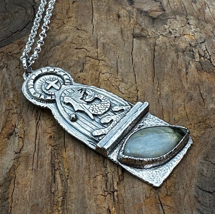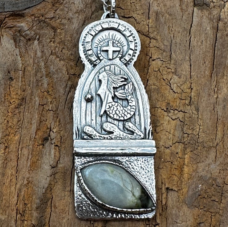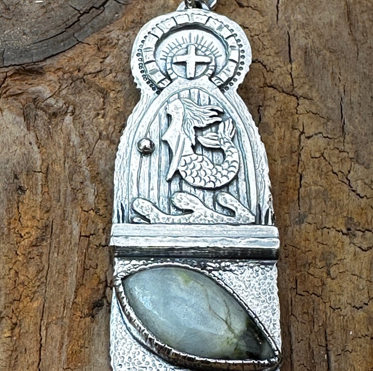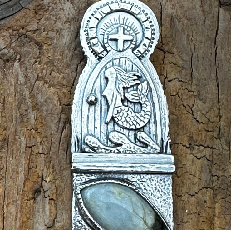 I love visiting old churches - I'm fascinated by how we find mermaids often entwined within these beautiful buildings. My original inspiration came from The Mermaid of Zennor but having also visited the beautiful Isle of Iona I could not resist a Scottish Mermaid set with a lovely Iona Marble Cabochon.