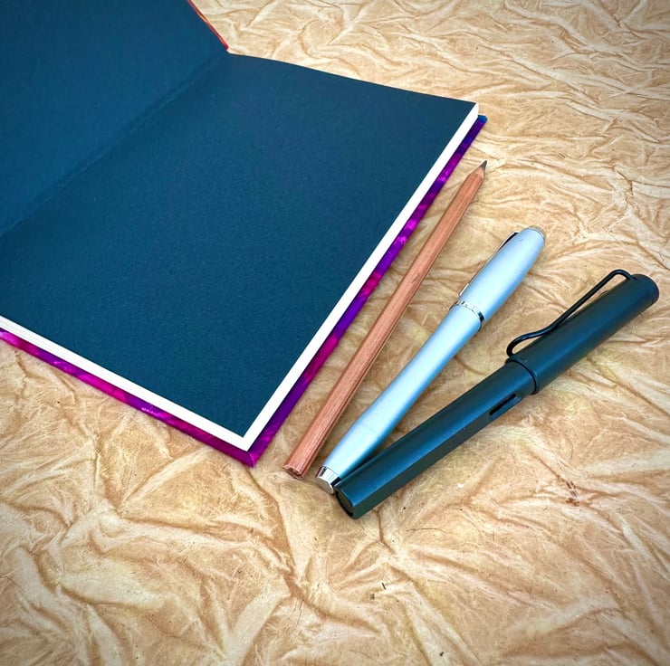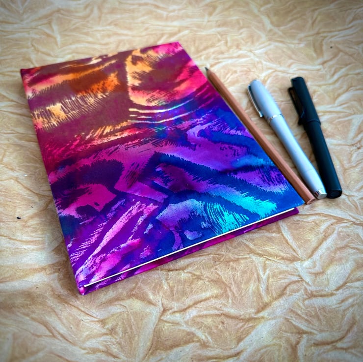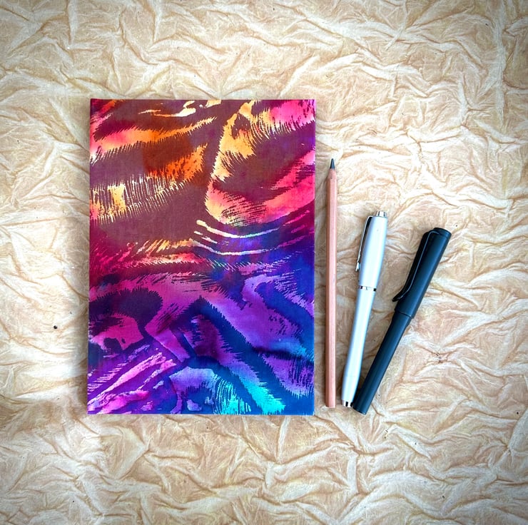 This blank notebook is ideal for journaling, sketching or note-taking. Filled with 110gsm plain ivory recycled paper which takes pencil, ink and dry art media such as crayons, pastels and charcoal with minimal bleed through. The cover features cotton fabric in bright sunset colours.