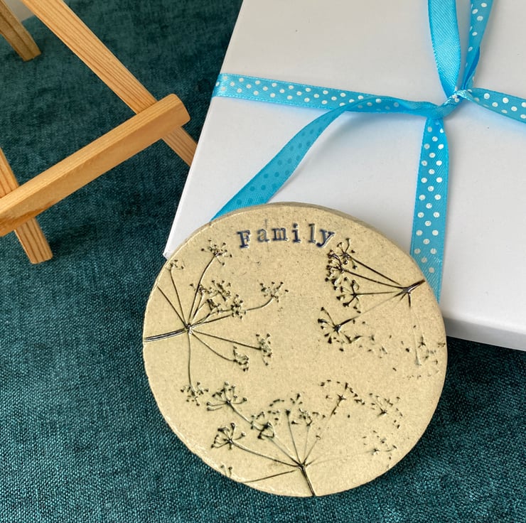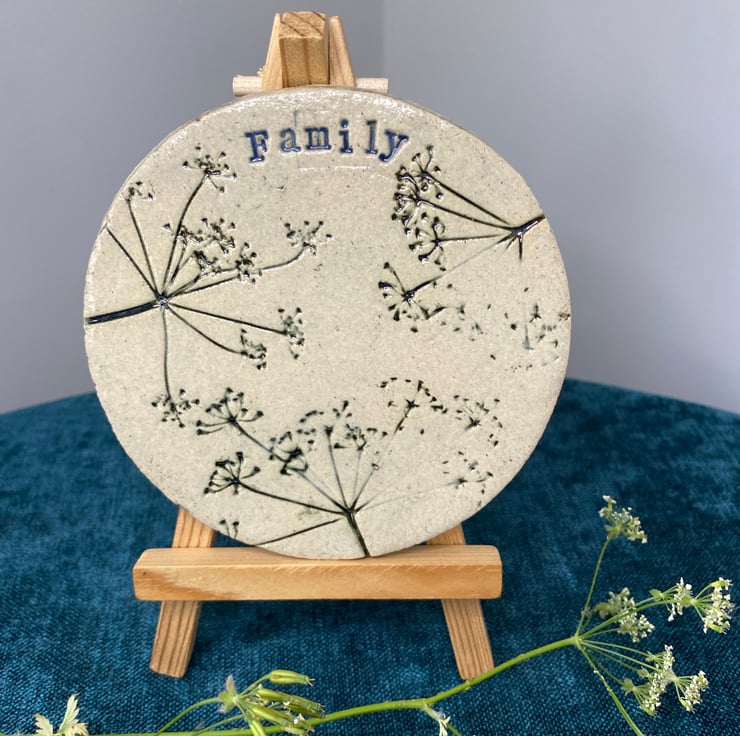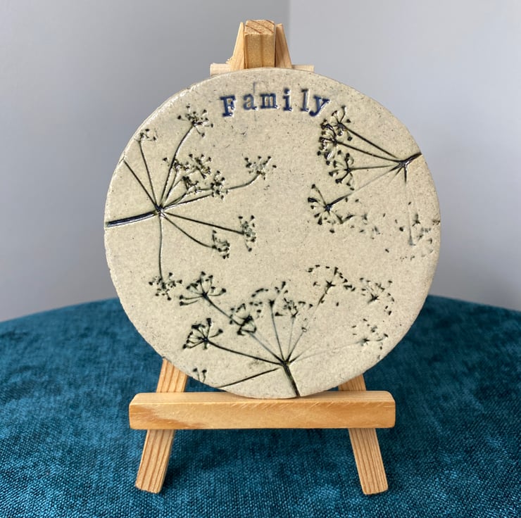 This handmade ceramic tile has been created from earthenware clay which is rolled by hand. The word 'Family' and hedgerow flowers have been pressed into the clay, which is then under glazed and kiln fired. After removing it from the kiln it is glazed again, this time picking out the detail with a Palladian mix glaze and fired again at 1240 degrees c. The process takes around 3 weeks. The tile is the backed with cork making it suitable to use as a coaster or small trivet to fit a teapot, or it can be displayed on an easel. (Available to add to your order)