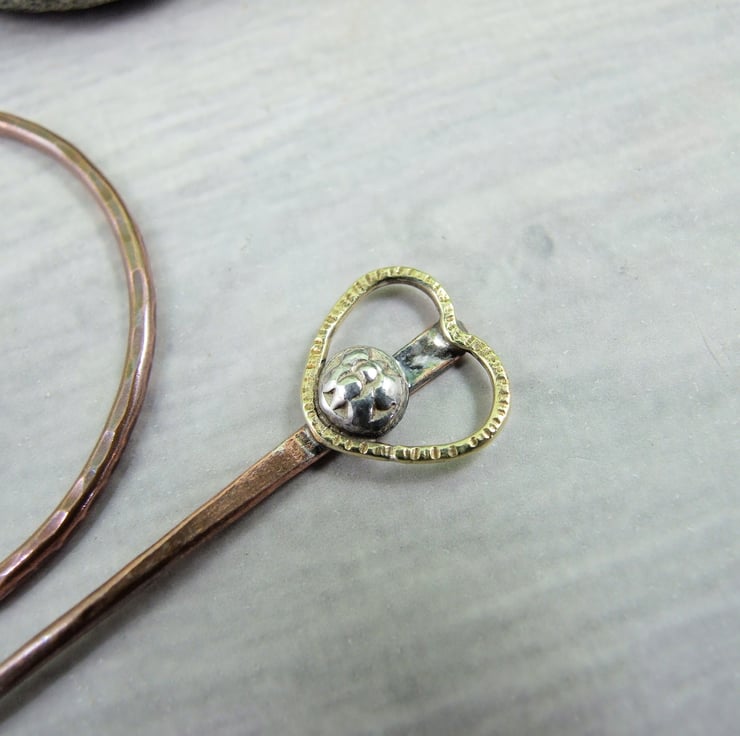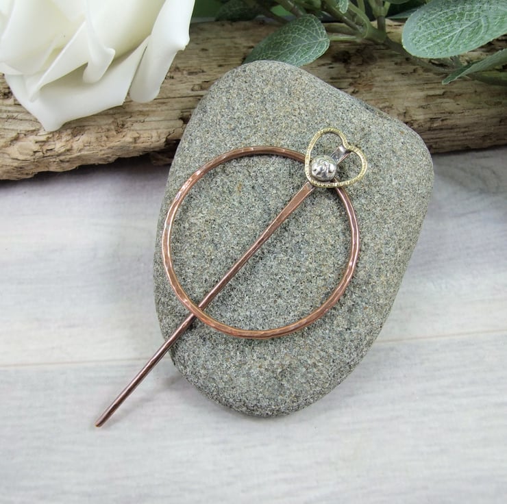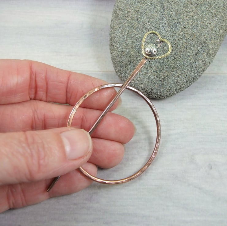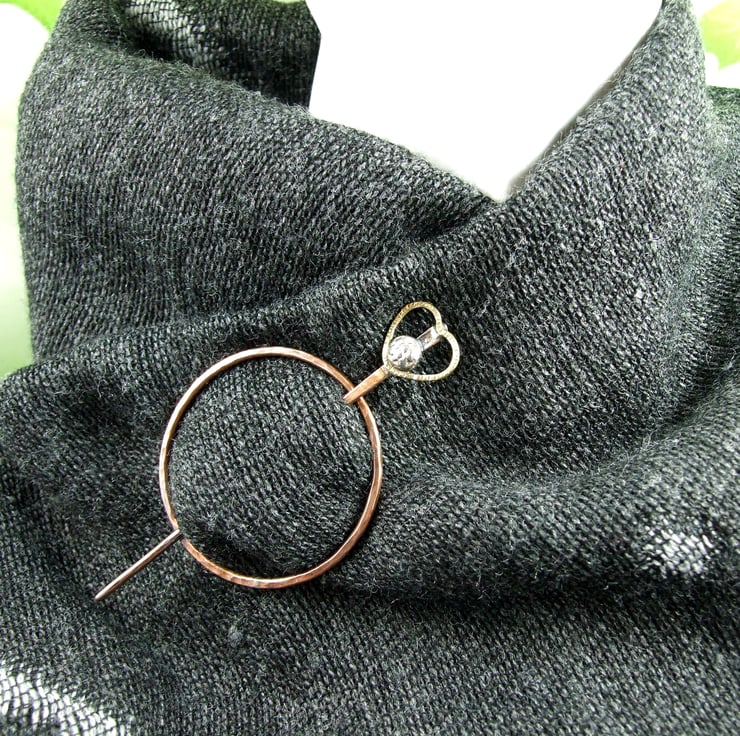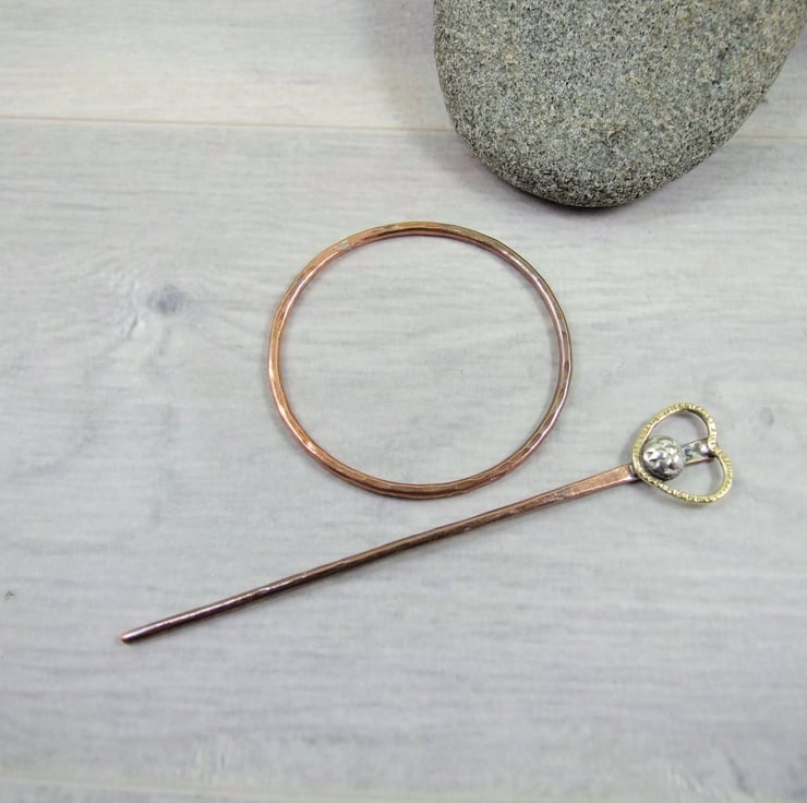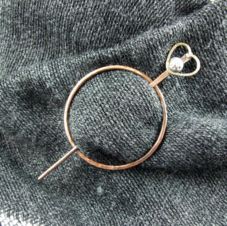 The ring is hand forged from 2mm solid Copper wire with hammered texture. The the pin is made from 2mm wire, shaped with a rounded blunt point at one end and a small brass heart shape and silver flower the other.