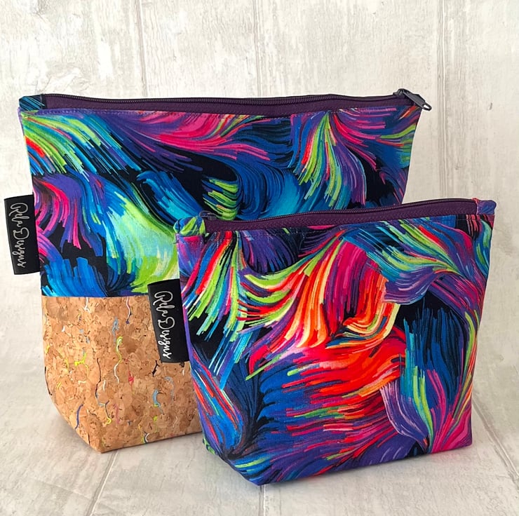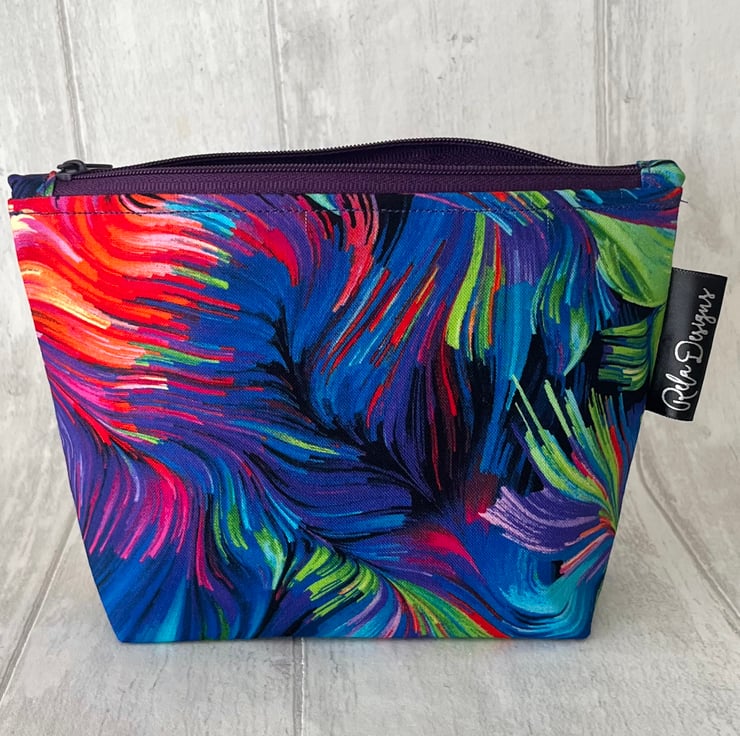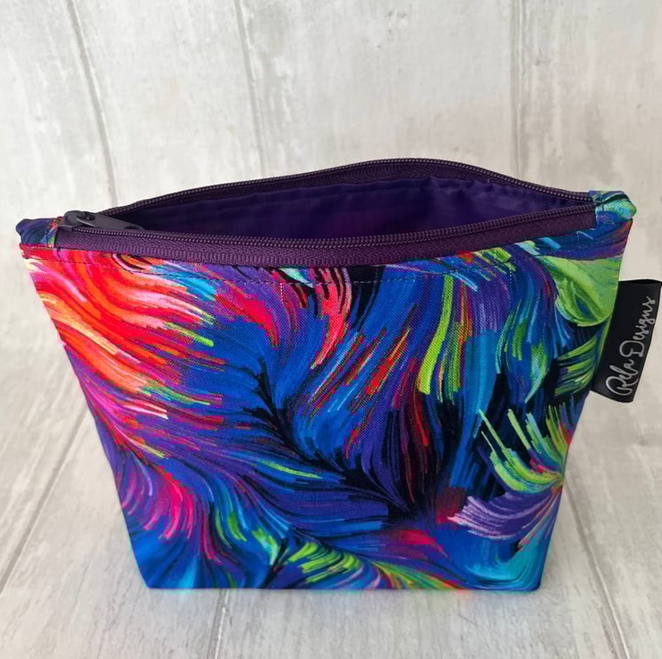 This bright print cotton zipped pouch has a purple waterproof nylon lining , great for those inevitable spills.