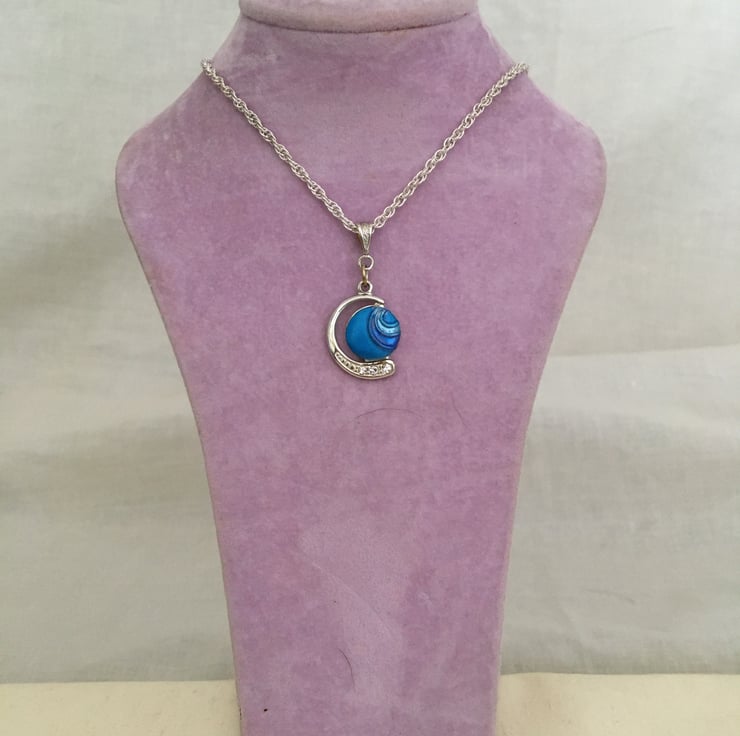 An blue centred pendant with 3 tiny crystals in a quality silver tone setting.