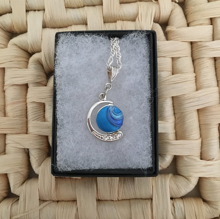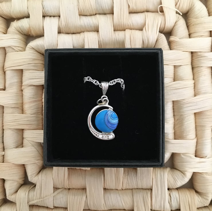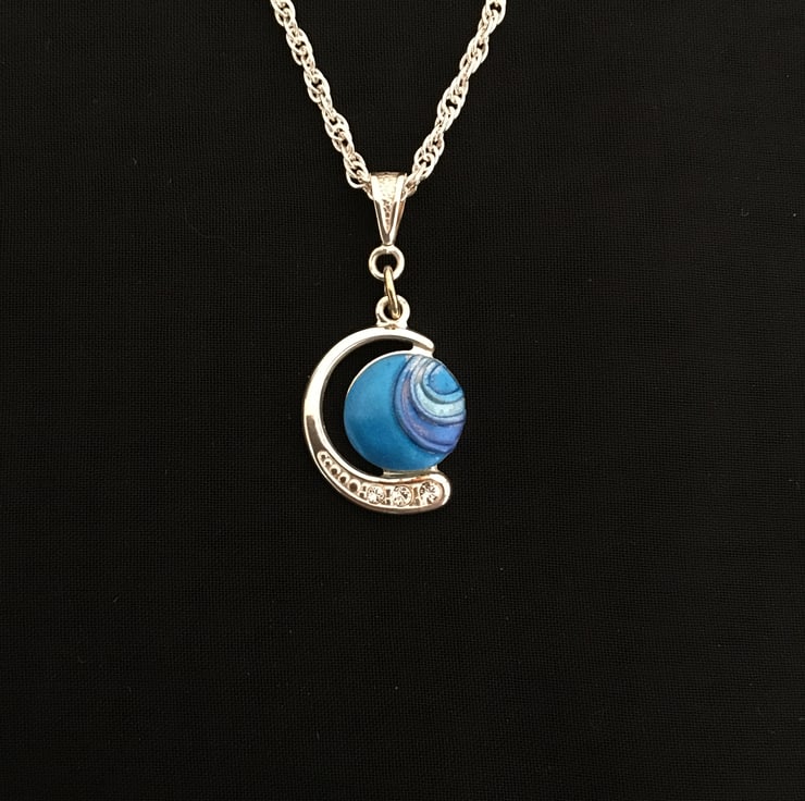 An blue centred pendant with 3 tiny crystals in a quality silver tone setting.
