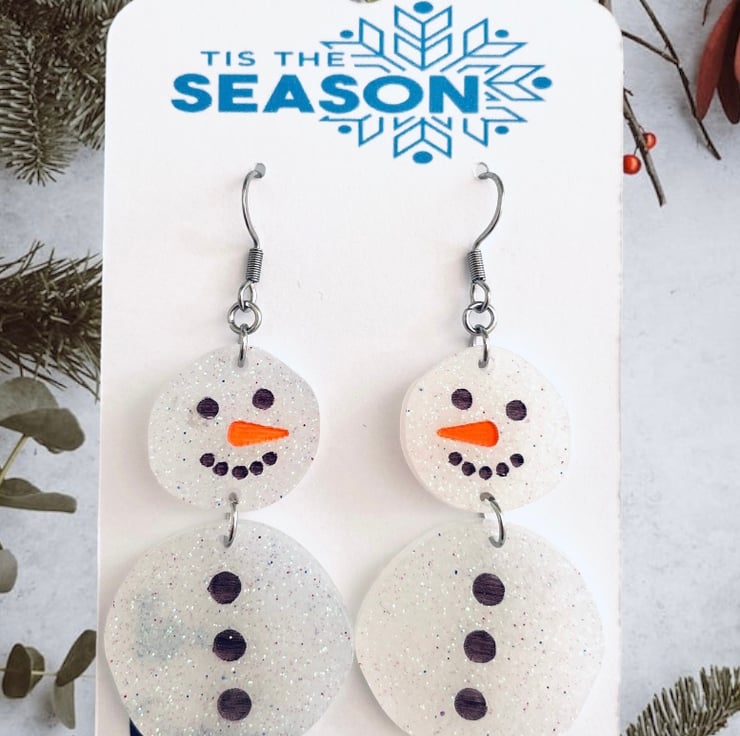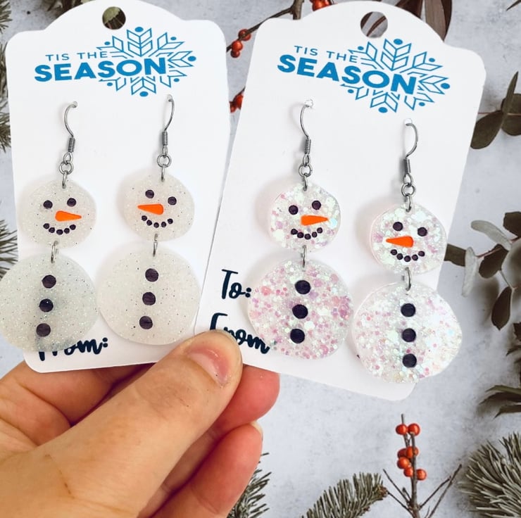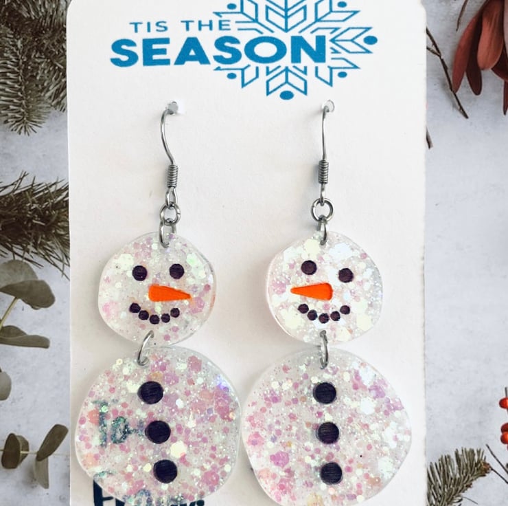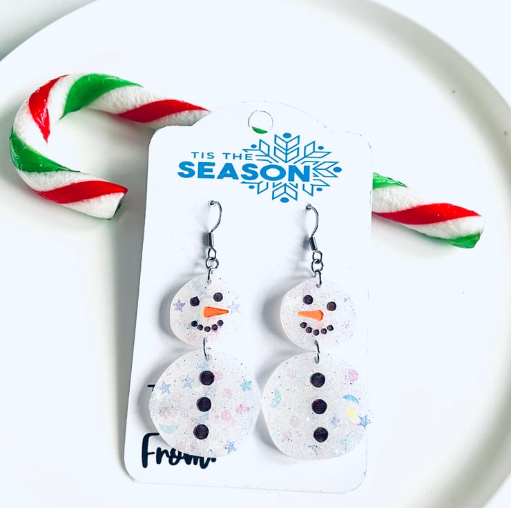 Bright and eye catching snowman earrings. These statement earrings will look great with your favourite Christmas outfit! Made with resin and various glitters.