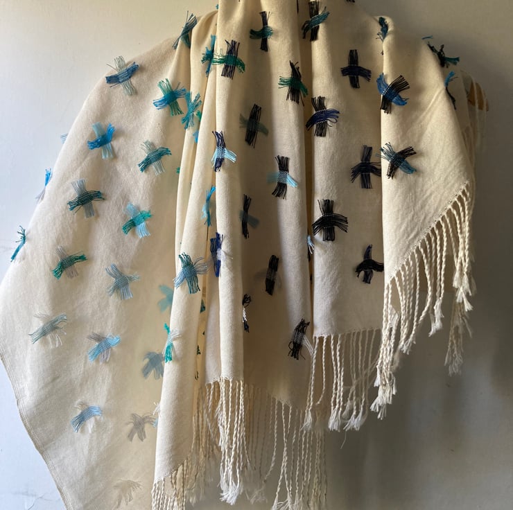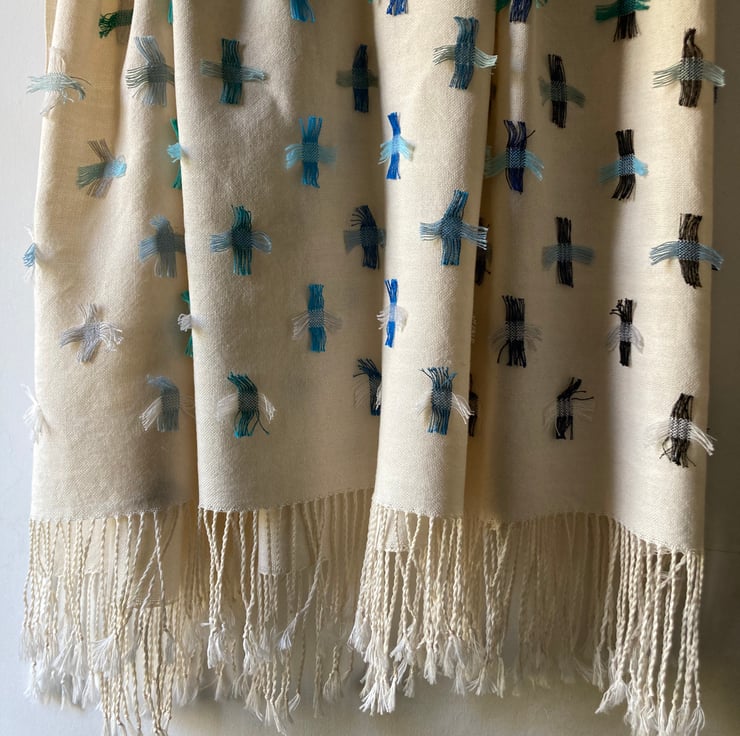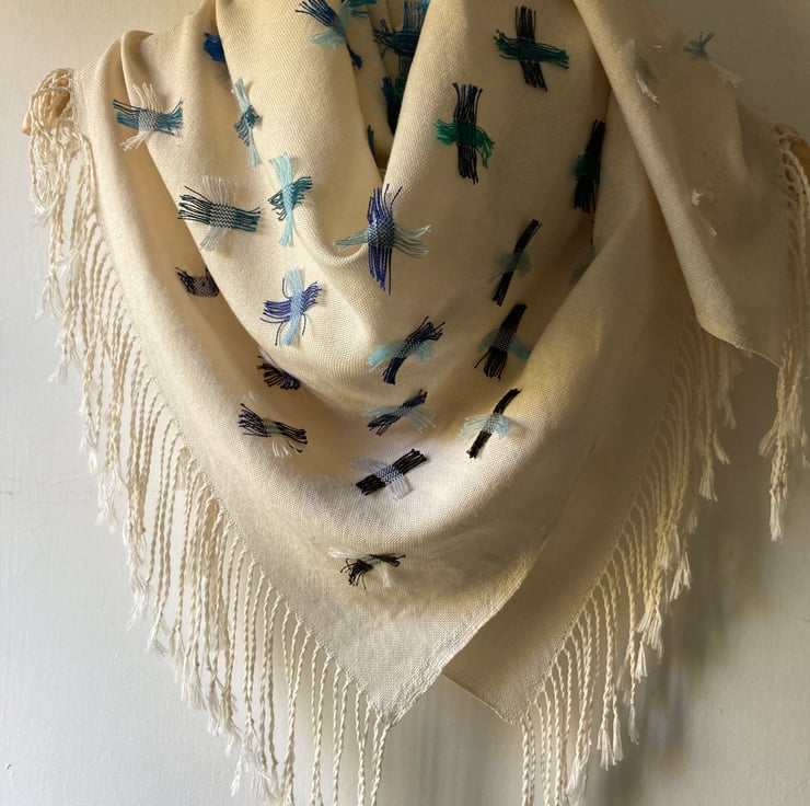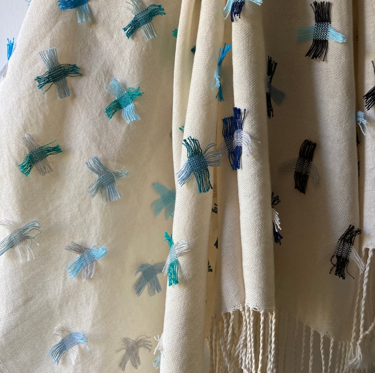 A handwoven wrap scarf inlaid with in 17 shades of the cadging waves on the North Yorkshire coast. A unique draft to celebrate the joys of the sea at high tide . Each square is cut to form tiny tassels squares. The colours are repeated across the weft to produce visual blending- no two blocks are the same across the repeat.Soft and supple, the square wrap is light and silky, and large enough to fold diagonally and wrap, bandana-style. The reverse is a beautifully-subtle chequered pattern, so the wrap can be worn two ways. The colours are taken from many photographs of this beautiful place to capture the spirit of the sea wherever you are.