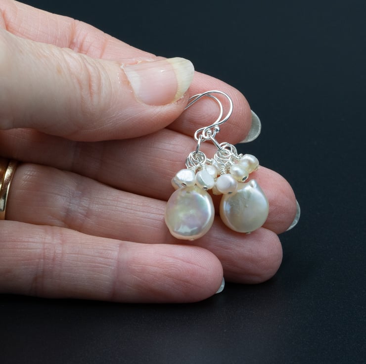 Natural cream pearl coins hang below a cluster of matching small pearls to create these dainty dangles. Perfect for day or evening wear.