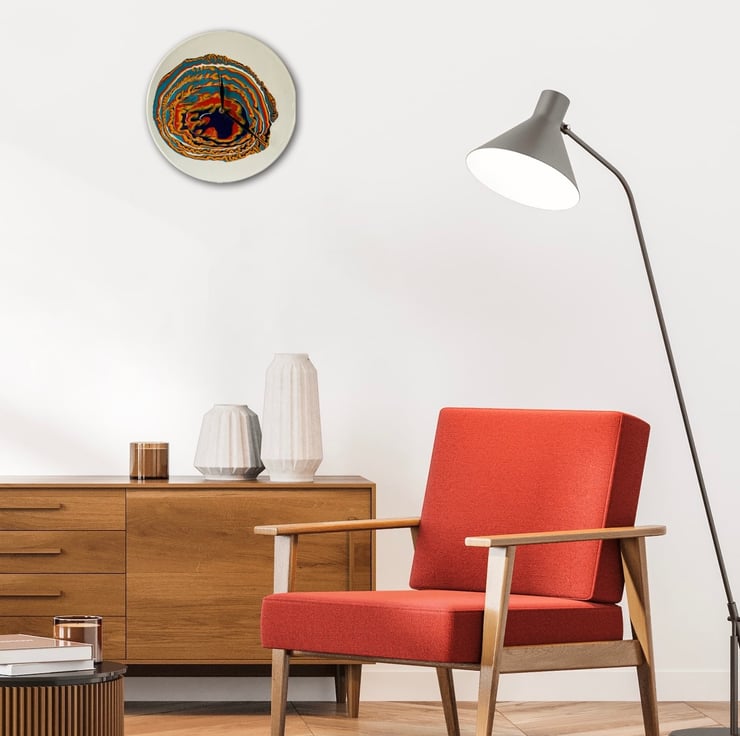 Upcycled from an vinyl LP record this 12”/30cm wall clock has been hand painted and varnished with quality materials and felted on the back for a clean look. It is fitted with a quartz mechanism (ticking) and black hands. Eco packaged and gift wrapped if desired. Free postage to UK buyers and reduced postage to USA.