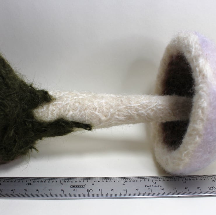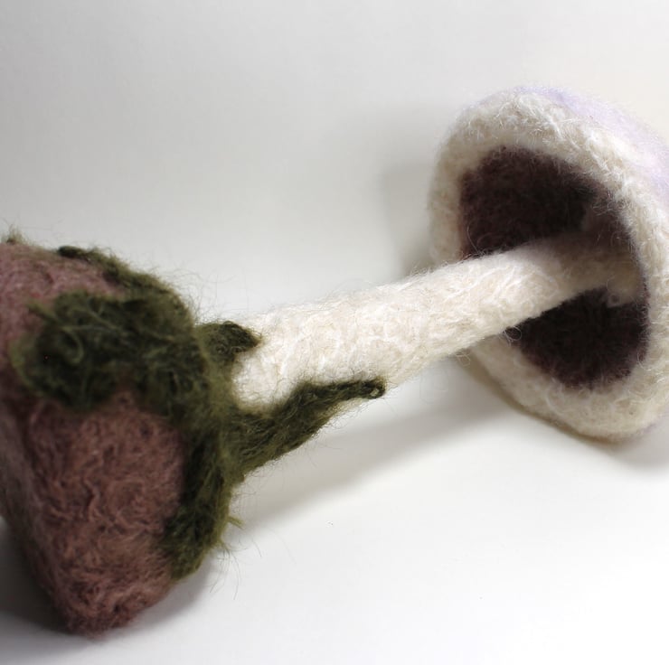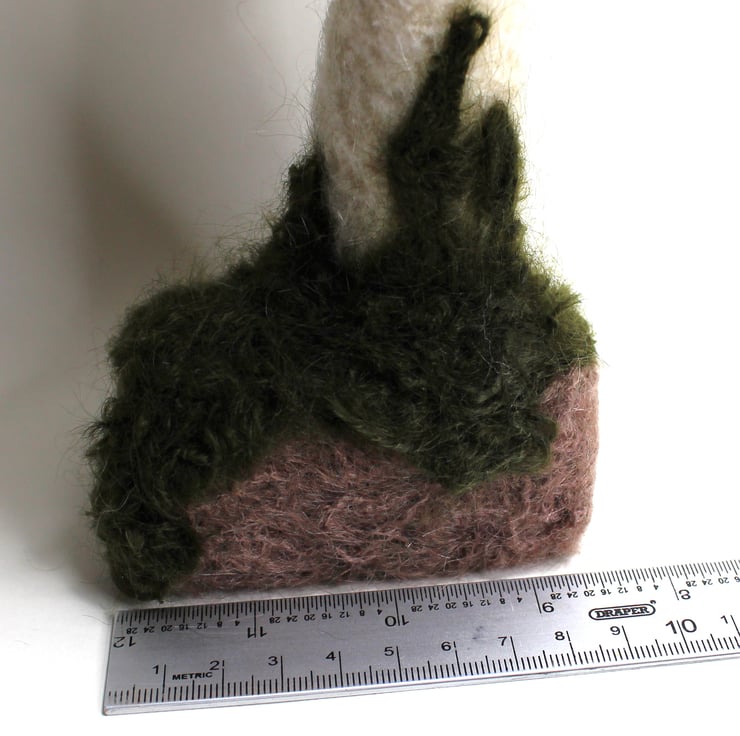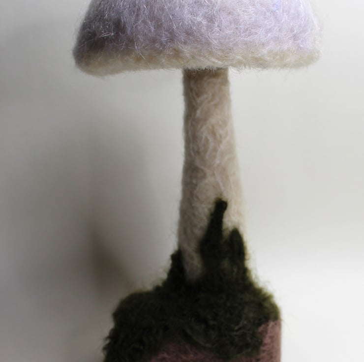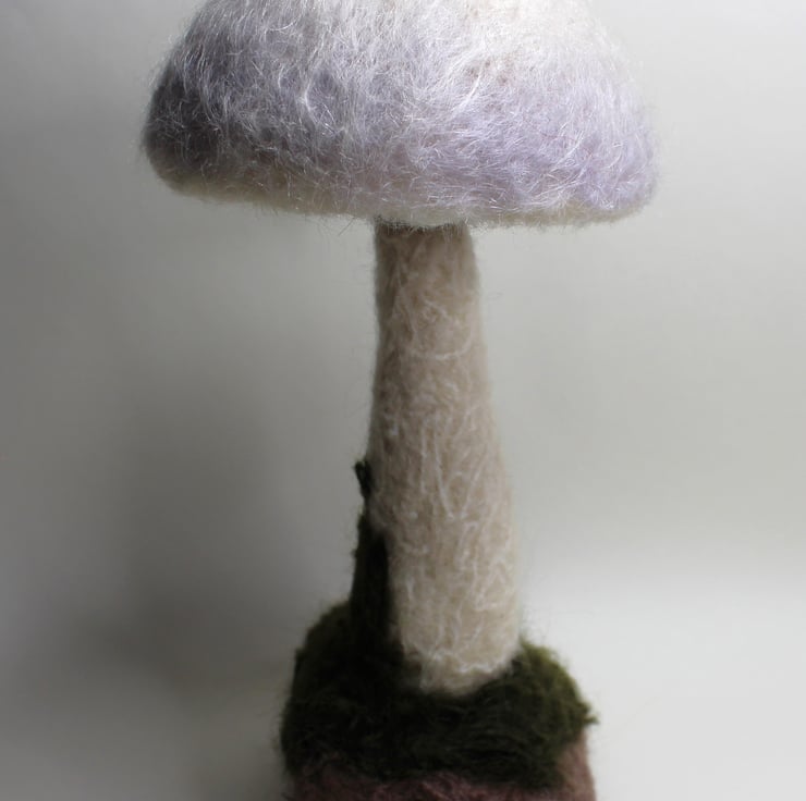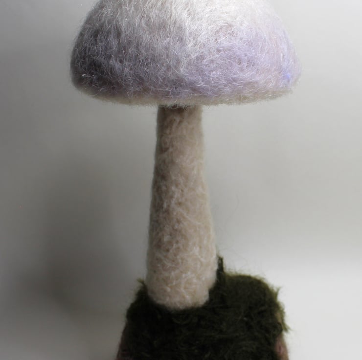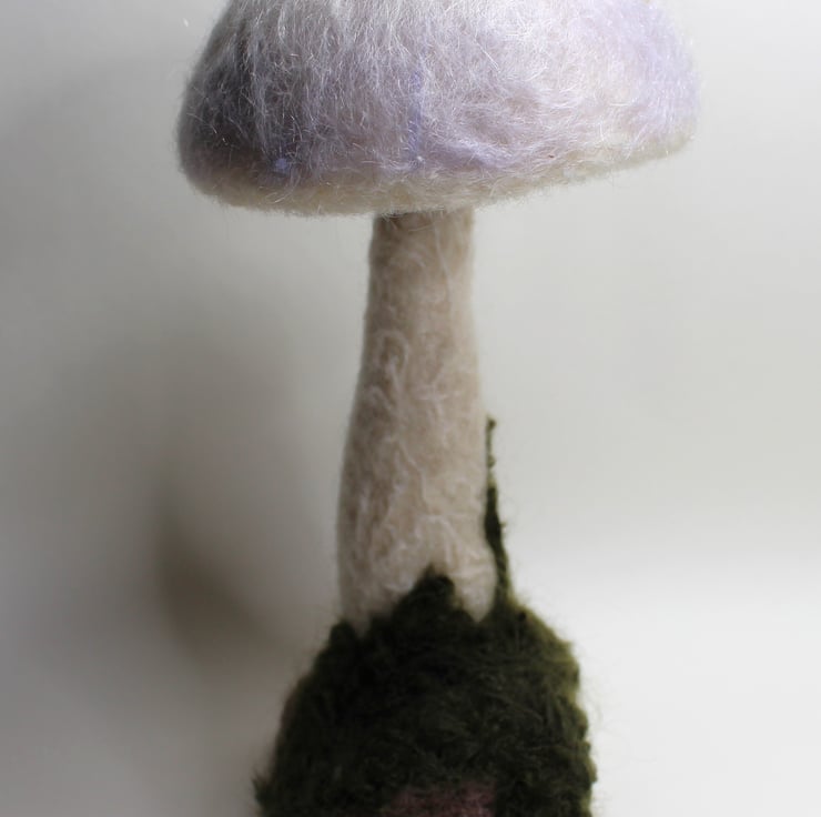 The wool to make this mushroom was washed and carded by hand before being painstakingly needle felted together to create this delightful mushroom. It sits atop a small piece of wood (also felted) with little tendrils of moss climbing their way up the mushrooms stalk. It adds a wonderful touch of the english woodland without the dirt that would usually come with it.