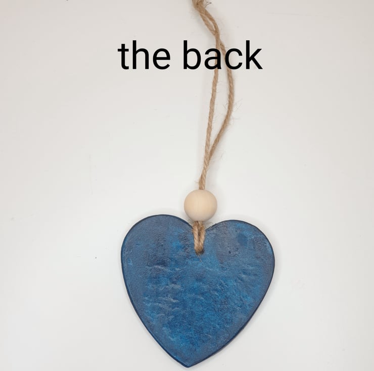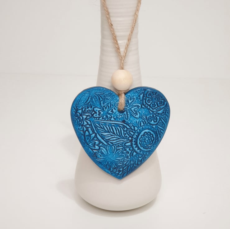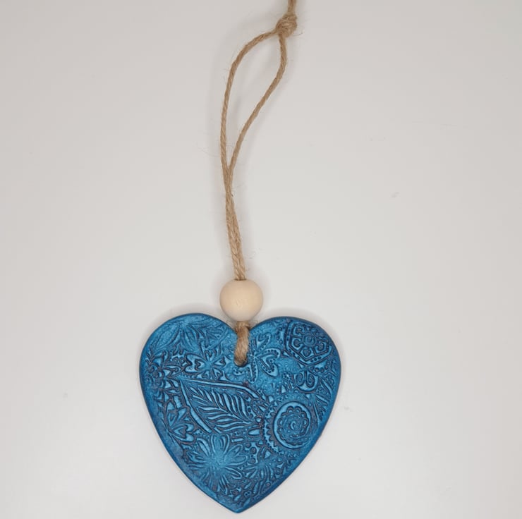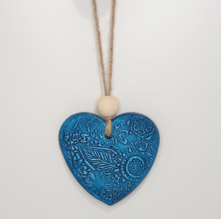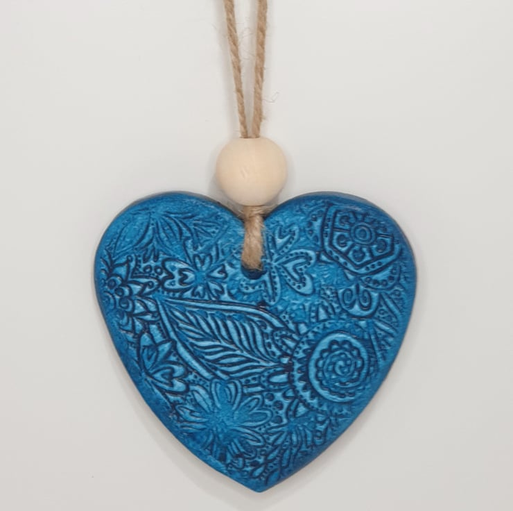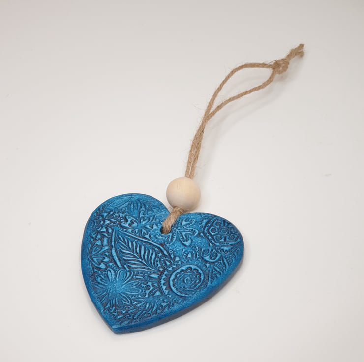 Blue heart hanging decoration created from air dry clay and embossed with a floral pattern on the front and the back has been left smooth. This pretty heart has been painted with petrol blue acrylic and varnished. Ready to hang from twine finished with a wooden bead this would make a lovely addition to your home decor or a lovely gift for an anniversary, birthday, Valentines, Mother's Day or to pop on a Christmas tree.