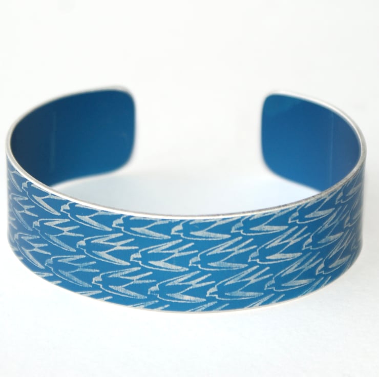 A striking bracelet/cuff made from anodised aluminium with a swallow pattern designed digitally by me. I made the drawing into a resist and applied it to the metal. I then dye the aluminium, seal it and remove the resist which leaves the pattern showing in the original colour of the metal. The cuff is then made using traditional metalworking techniques.