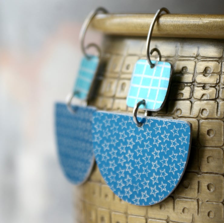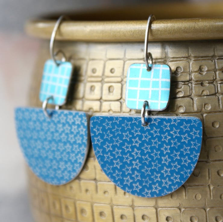 SALE (discontinued) A fab pair of earrings handmade from sterling silver and anodised aluminium. The aluminium pieces have star & crosshatch patterns which have been applied to the metal, then dyed. The ear wires are hand made from sterling silver.