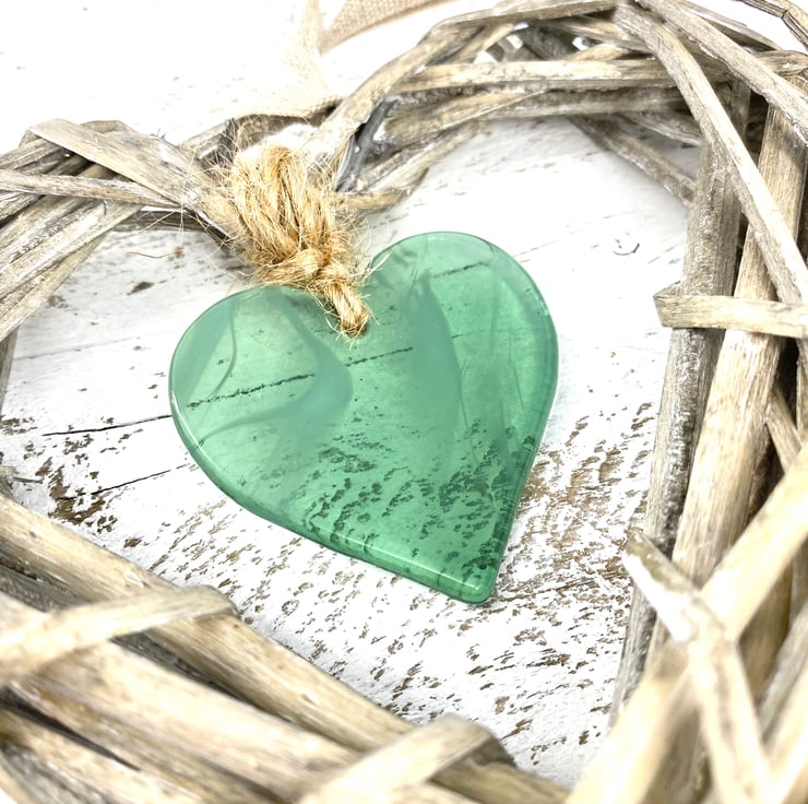 A gorgeous heart made from wispy sea green & white glass.