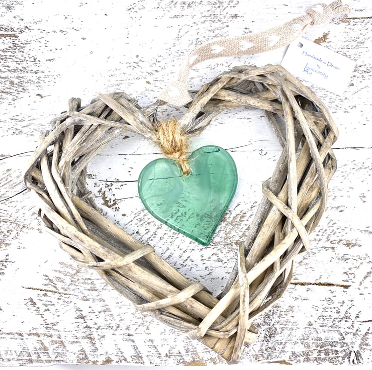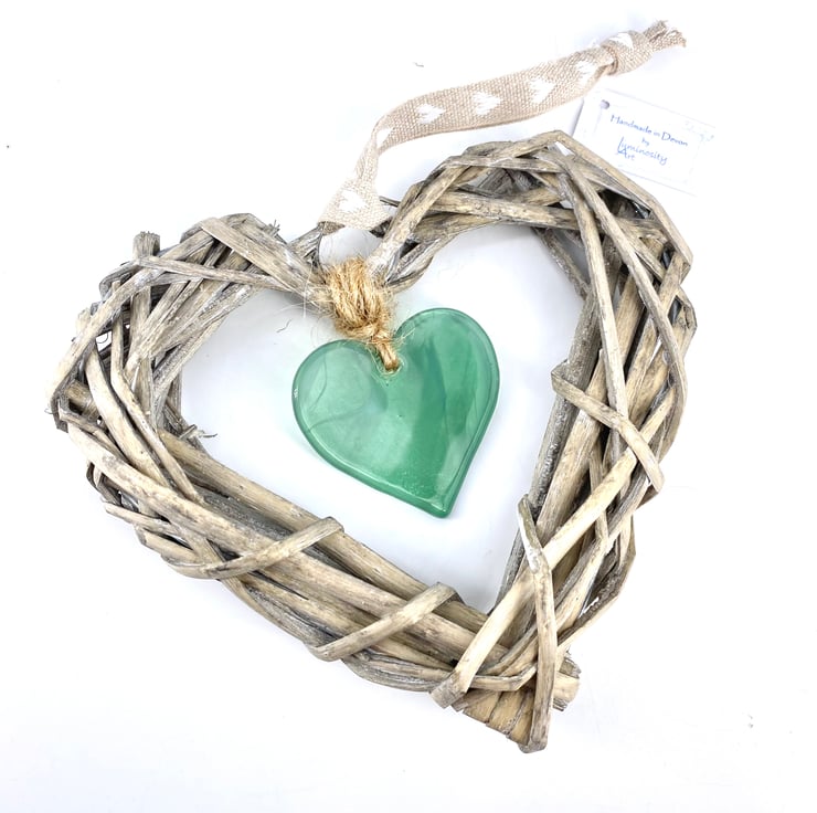 Wicker heart measures 15cm and the glass is 5cm.