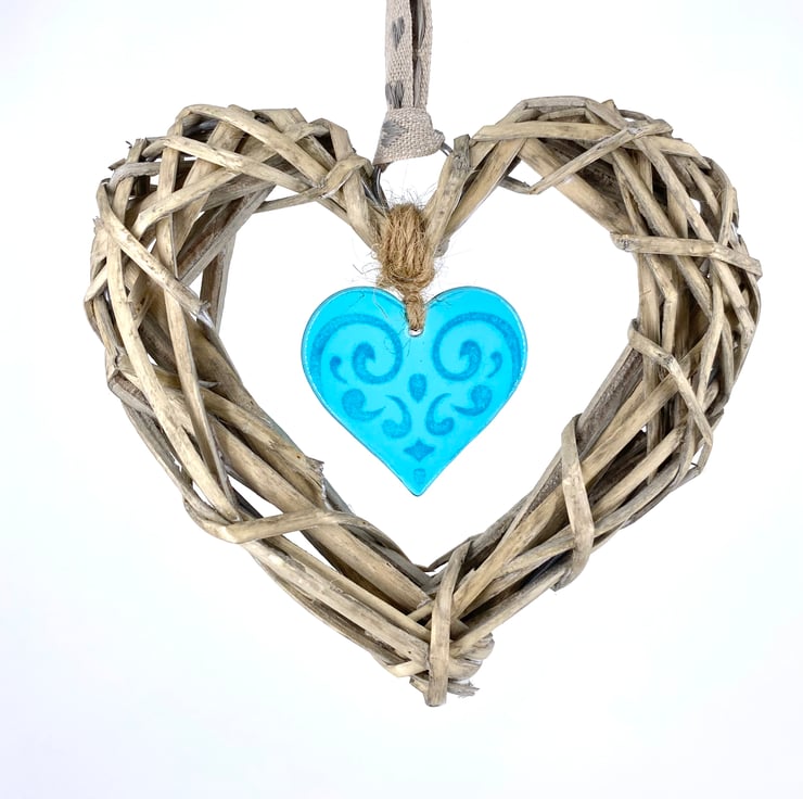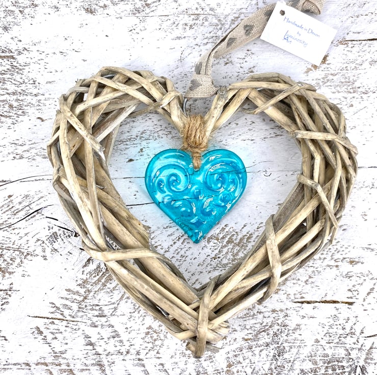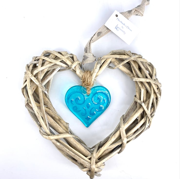 It is suspended in the middle of a wicker heart and has been finished with a length of linen ribbon.