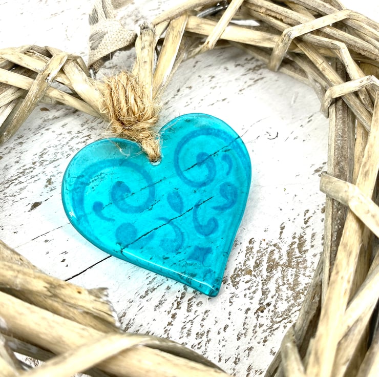 A gorgeous heart made from stunning Caribbean Blue glass with stencil detail.