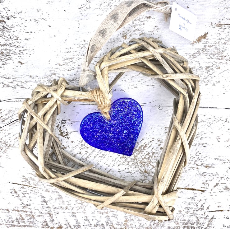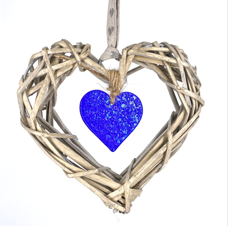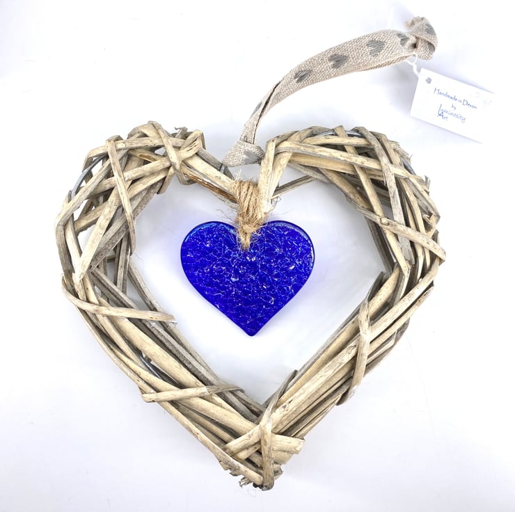 It is suspended in the middle of a wicker heart and has been finished with a length of linen ribbon.