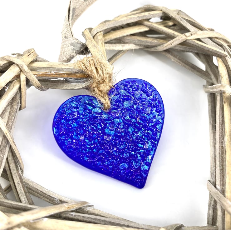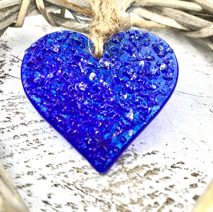A gorgeous heart made from beautiful royal blue glass with an iridescent sheen.