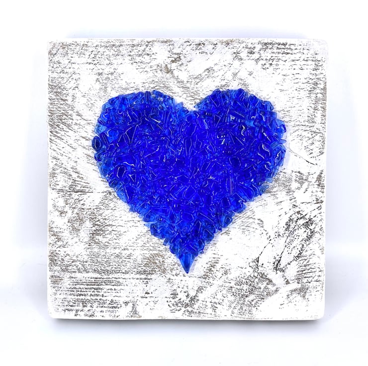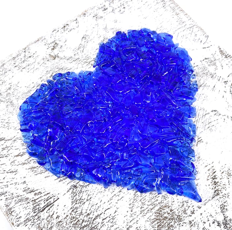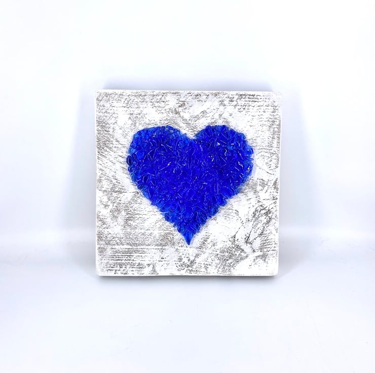 A gorgeous rustic heart picture which has been made from hundreds of pieces of blue glass.