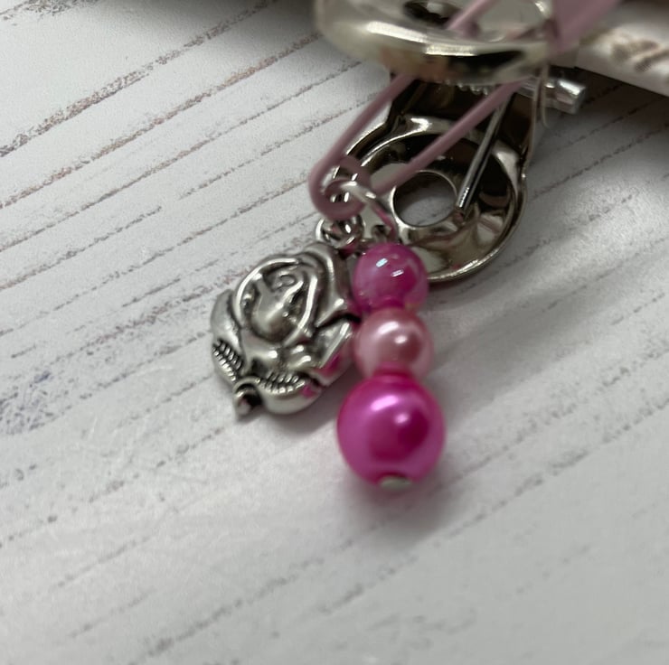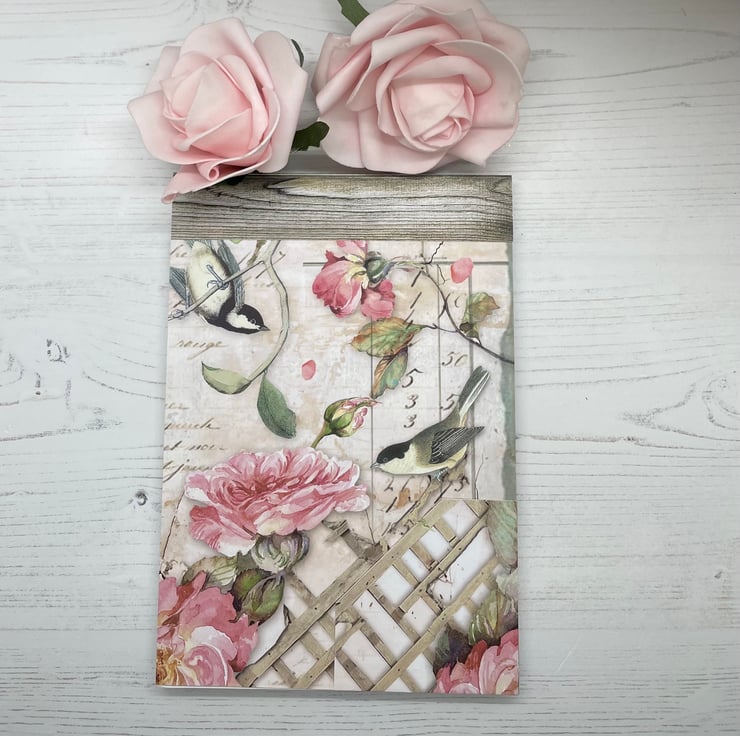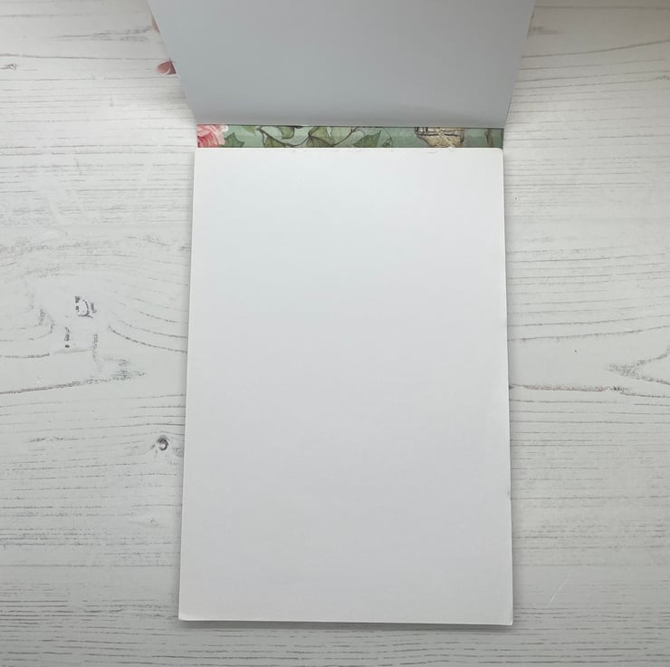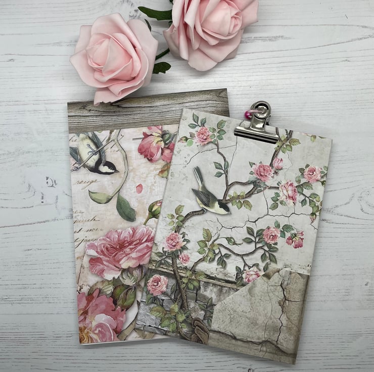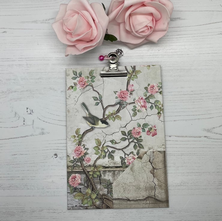 Plain flip notebook, covered in a pretty rose and bird print paper with complementary clip board. Pink pin with pearl beads and a rose charm secured to the bull dog clip. A perfect desk accessory for yourself or to gift.