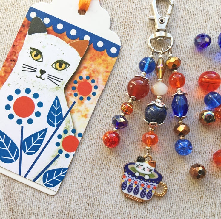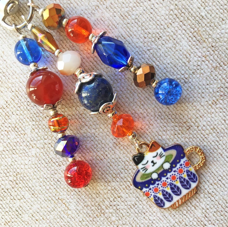 I've used a cute, gold-plated enamel charm and an assortment of glass and semi-precious beads including Lapis lazuli, Carnelian and crackle glass.