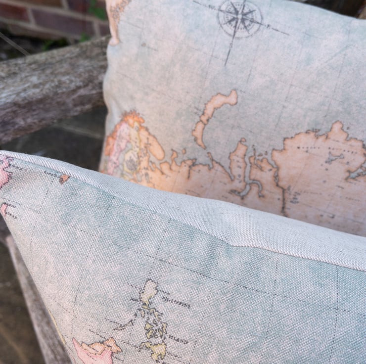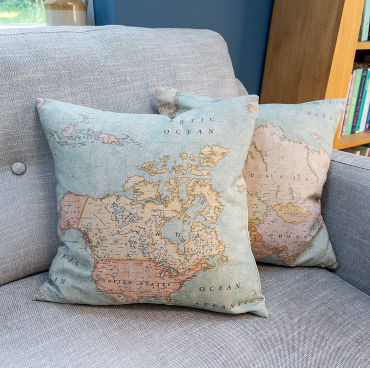 World map cotton cushion cover with beige linen back. In the style of an antique map with a grey blue background and colourful countries.