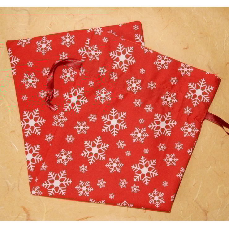 This re-usable fabric bottle bag is eco-friendly and makes presenting a bottle into an extra special gift. This will save so much paper and card, and looks very attractive. A lovely way to present a luxury bottle of fizz, or any wine. It measures 6 inches wide by 15 inch deep. (approx. 15 x 38 cm.) It has a drawstring fastening, and is lined in plain red fabric. The main fabric red with white snowflakes.