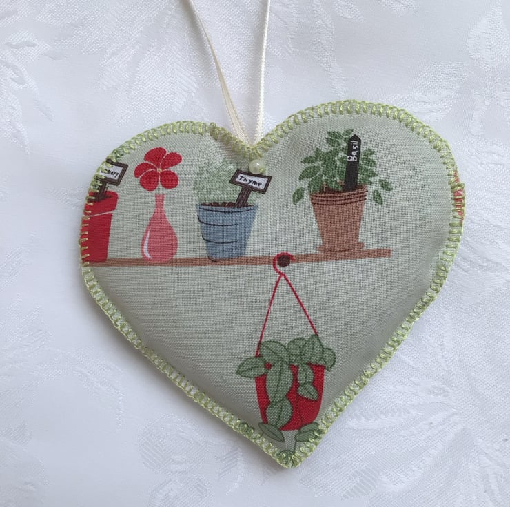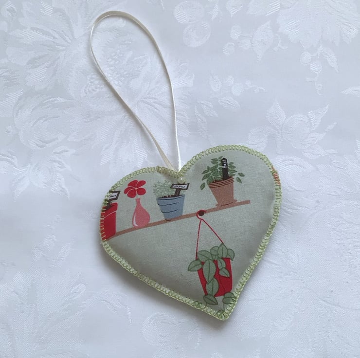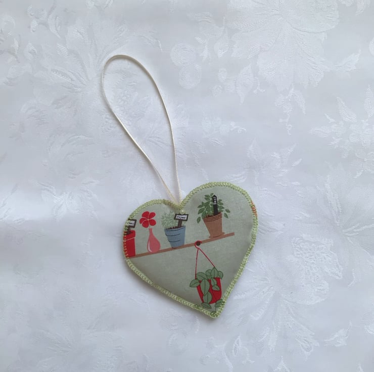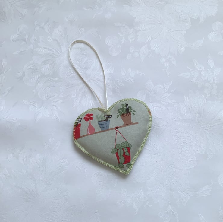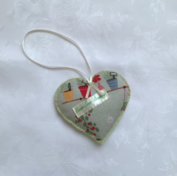 Hanging heart fabric decoration. Made from a sage green fabric, with a plant design. Hand stitched, edged with blanket stitch. Filled with home grown lavender.