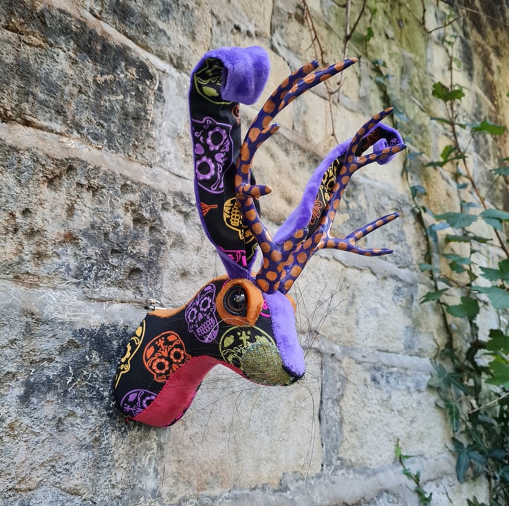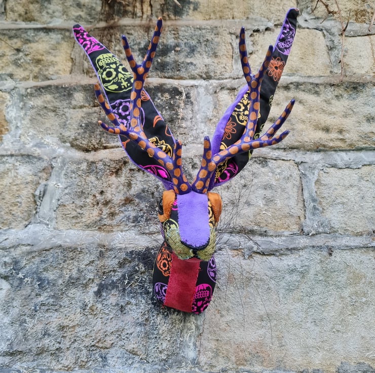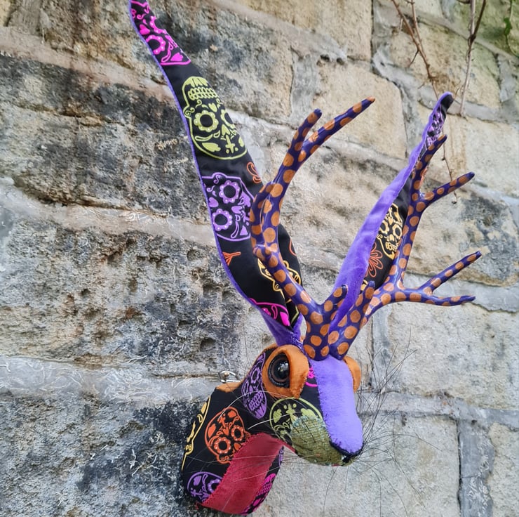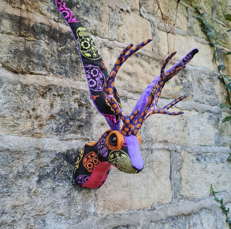 A lifesize faux jackalope (mythical hare with antlers) which I have handmade and covered in hand stitched Day of the dead skull fabric, upholstery fabric, velvet and tweed. The jackalope has hand painted antlers, giving a nod to the Mexican tradition of hand painted Alebrijes from Oaxaca. The ears can buy unfurled or curled up, as you prefer.