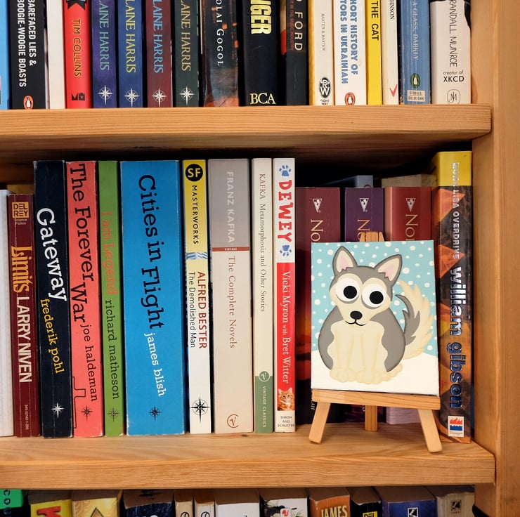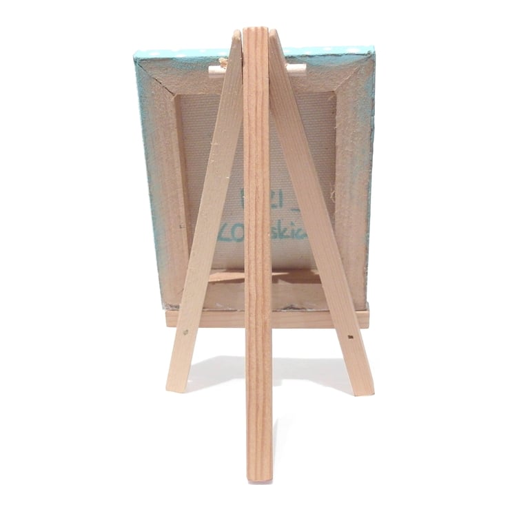 The arctic dog art will either come with a 14cm (5.5") miniature wooden easel for display, or will be strung with a ribbon in a colour that matches the painting so it can be hung on a wall (as in the final photo). Just choose with easel or ribbon hanging when you buy.
