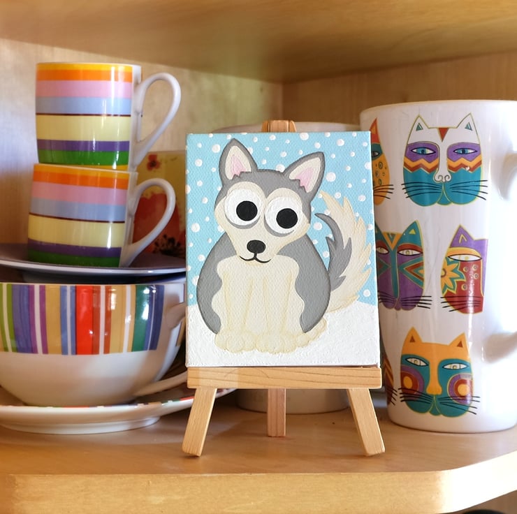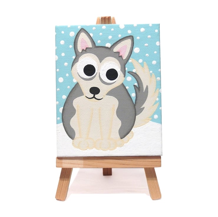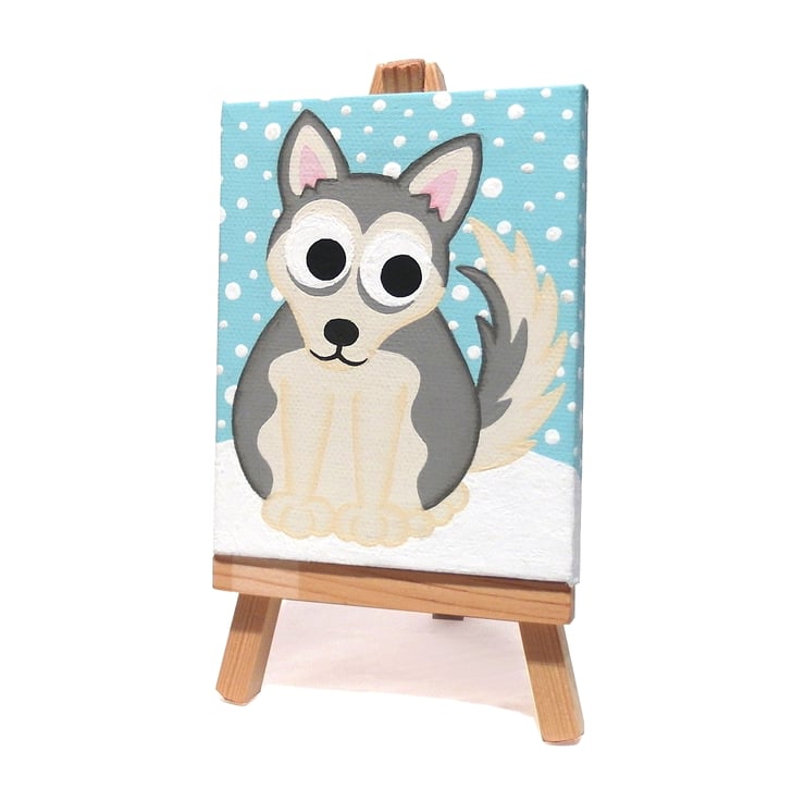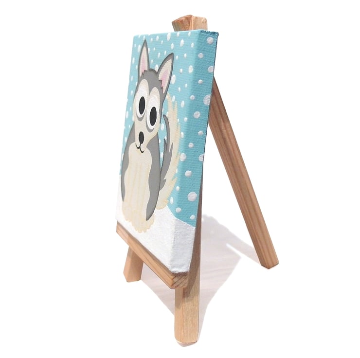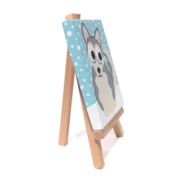 Husky Dog Mini Acrylic Painting - original snowy artwork on miniature canvas