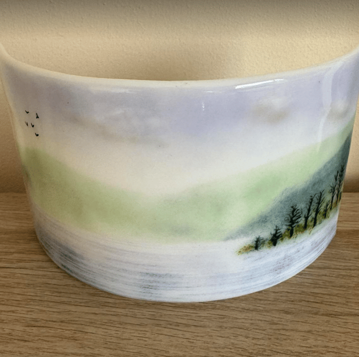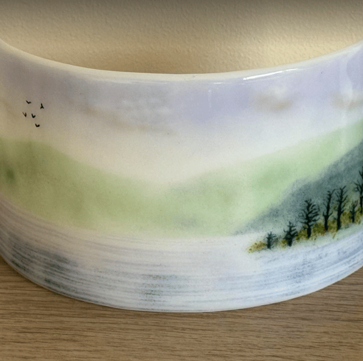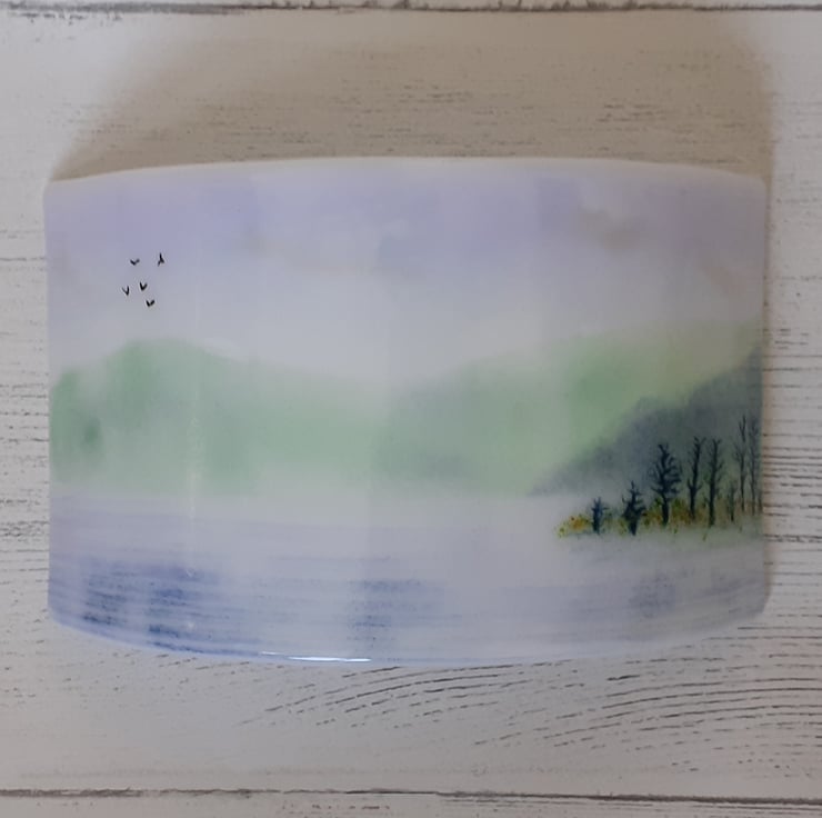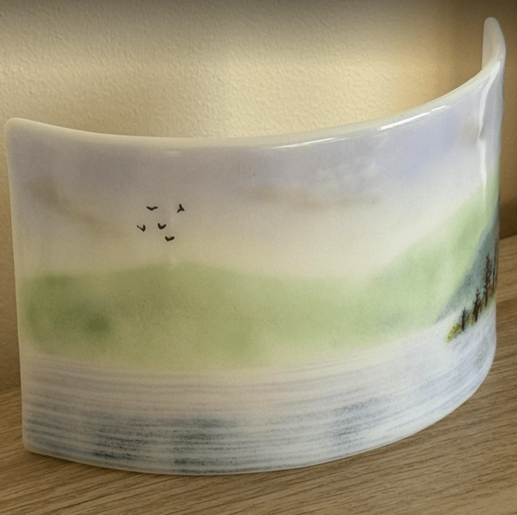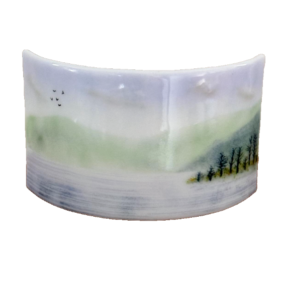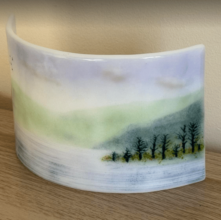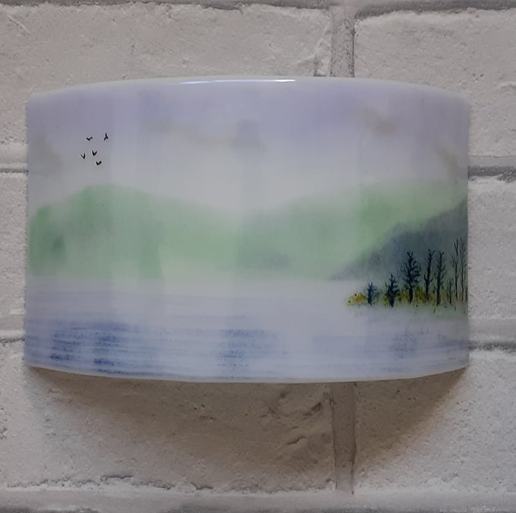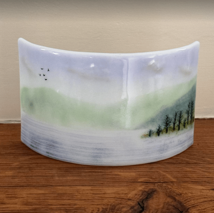 Fused glass freestanding curved panel featuring a background of misty mountains and a shoreline edged with bare winter trees.